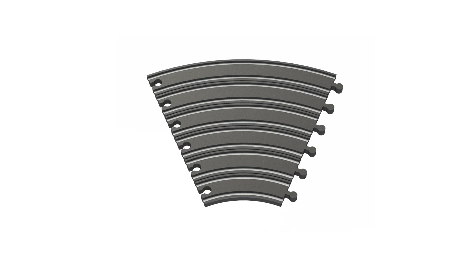 Bộ này gồm 6 phiên bản ray cong: có đoạn cong ngắn, đoạn cong tiêu chuẩn và các biến thể tăng theo bội số của bán kính. Tất cả các phiên bản đều ghép khít với nhau, rất hợp để làm đường ray song song đẹp mắt hoặc dựng layout theo ý bạn.