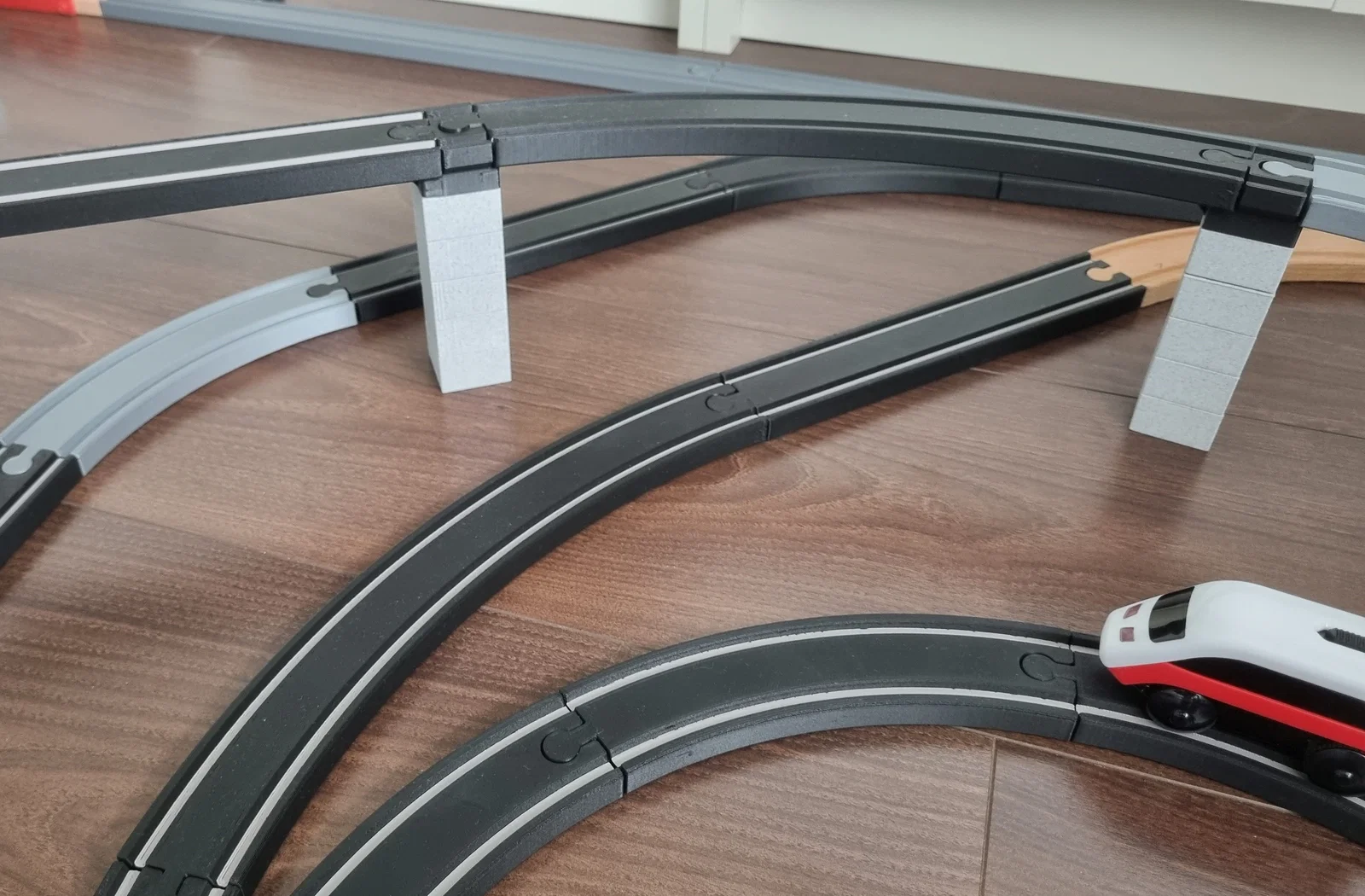 Bộ ray cong gồm 6 biến thể: cong ngắn, cong tiêu chuẩn và các phiên bản theo bội số của bán kính. Các đoạn ghép khít để làm đường ray song song hoặc layout tuỳ chỉnh, tương thích Brio và IKEA Lillabo.