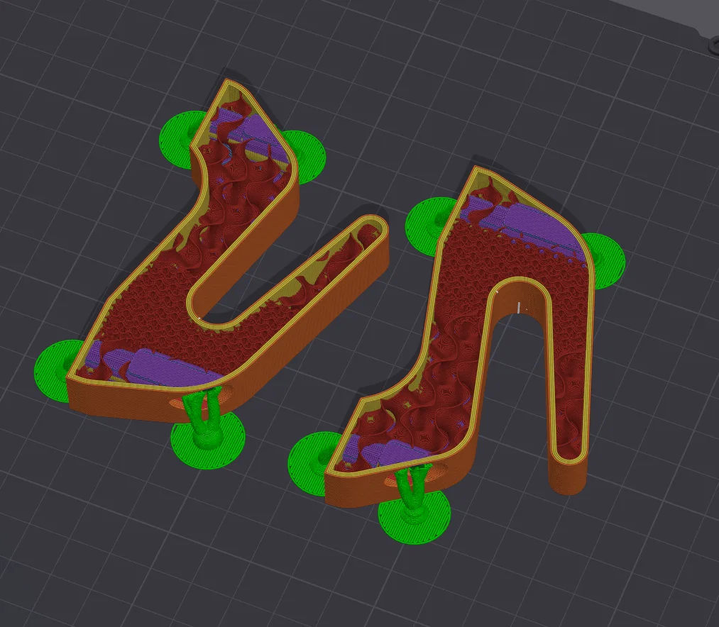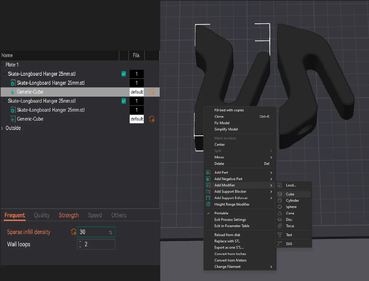PETG - 4 walls, 8-10% infill cho thiết lập in chung. Tạo 2 modifiers (xem hình hoặc nhấp chuột phải vào part, thêm cube modifier (55x20*20mm)), đặt chúng đúng như trong ảnh và chỉnh infill strength lên 25-30% cho cả hai. Thêm organic tree supports như hình minh họa.