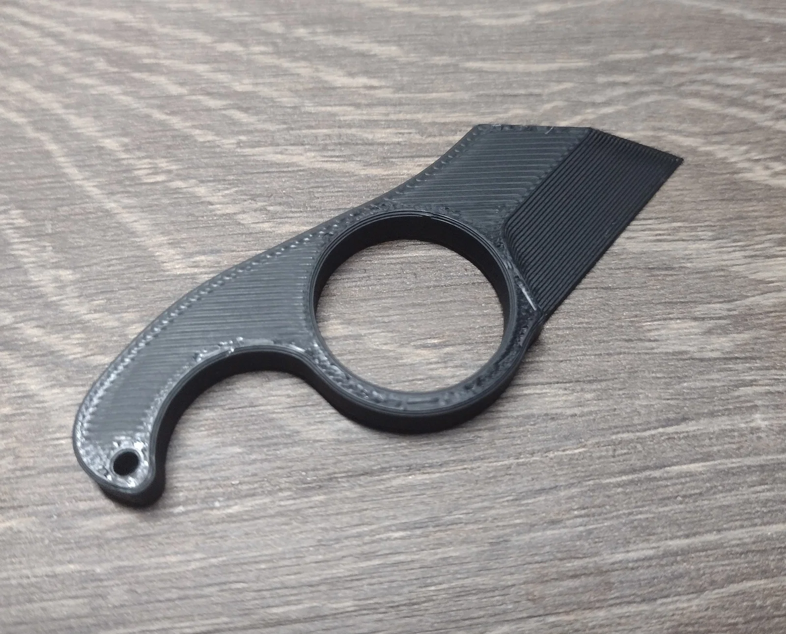 Mẫu dao nhỏ có thiết kế lỗ xỏ ngón tiện dụng, với đường kính lỗ mặc định là 20mm. Bạn có thể dễ dàng điều chỉnh tỉ lệ in (scale) dựa trên bảng kích thước nhẫn đi kèm để vừa vặn nhất với ngón tay của mình.