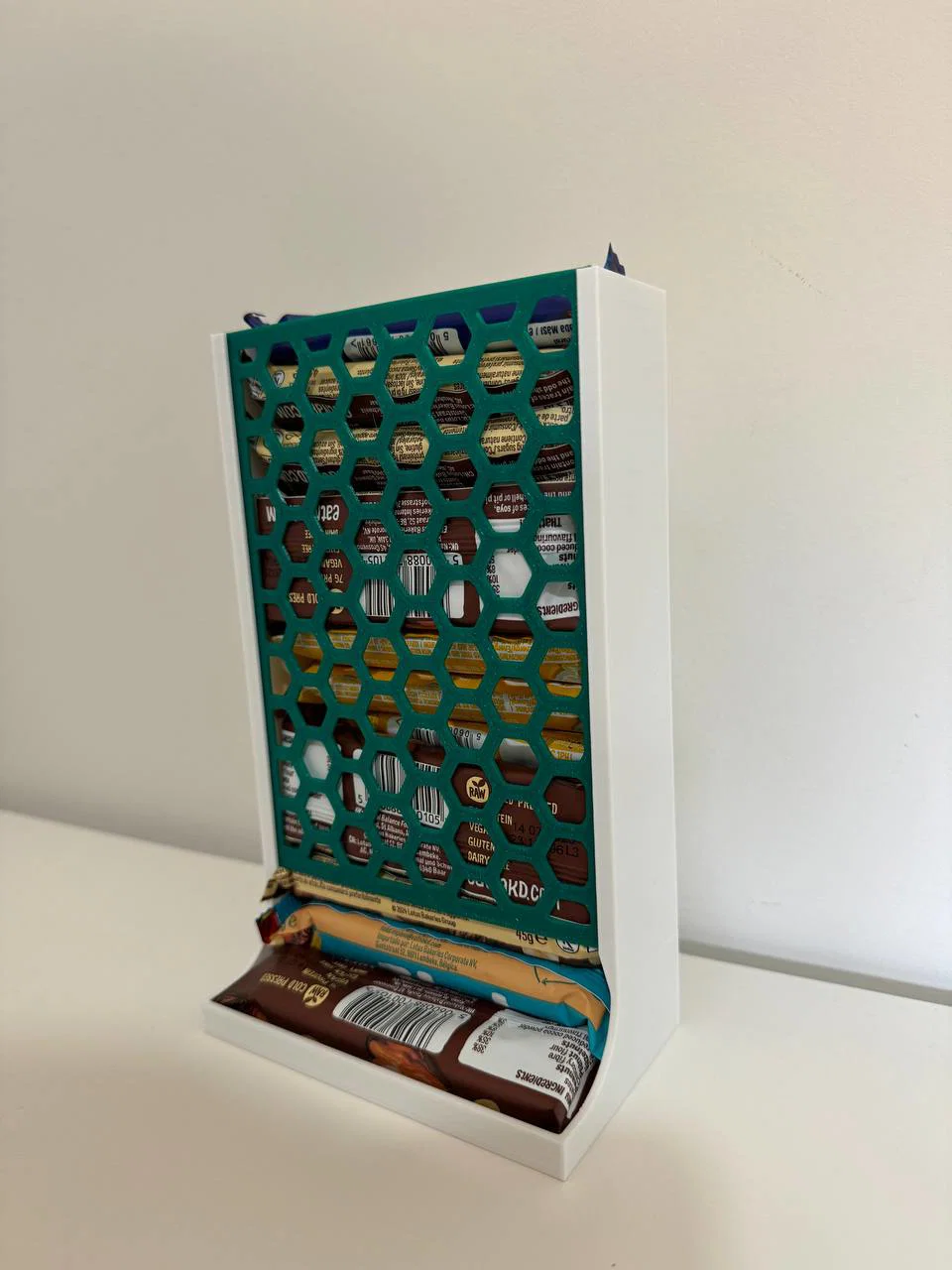 Một dispenser đơn giản để chứa và lấy các thanh snack/protein bar gọn gàng ở một chỗ. Model chia 2 phần (đế và mặt trước) giúp dễ in; phần mặt trước trượt vào là dùng được, không cần supports.