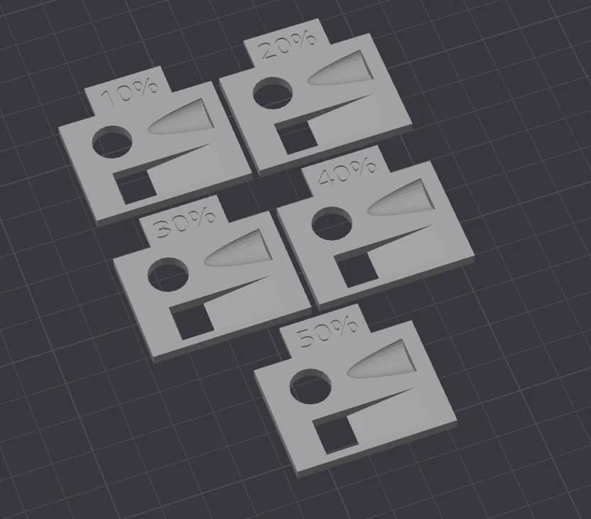 Mình làm bộ mẫu test ironing và tool để chỉnh ironing flow. Một plate gồm: test lỗ tròn, test ironing mặt dốc phẳng, và test ironing mặt dốc cong. Tùy theo setting, mỗi plate sẽ tốn khoảng 2–3g filament. Kích thước 1 plate là 40x40x3mm.