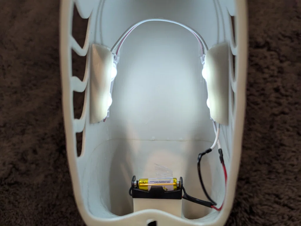 Vì đèn hoạt động không có công tắc, tôi quấn một chút băng keo quanh viên pin và tạo thành một cái ngàm khóa. Nhờ vậy có thể tháo pin ra rất dễ để tắt đèn. Bạn cũng có thể cắm pin vào khay pin ở mức “nửa chừng”, và khay vẫn giữ pin ngay cả khi đèn đang tắt.