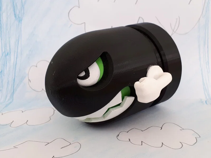 Bộ tay gắn thêm cho mẫu Banzai Bill của Sdvalentone để “biến hình” thành Bullet Bill. Tay in PLA có supports, dán lên thân zin bằng keo contact (Chemoprén/Pattex). Có kèm link dự án Tinkercad để chỉnh sửa.