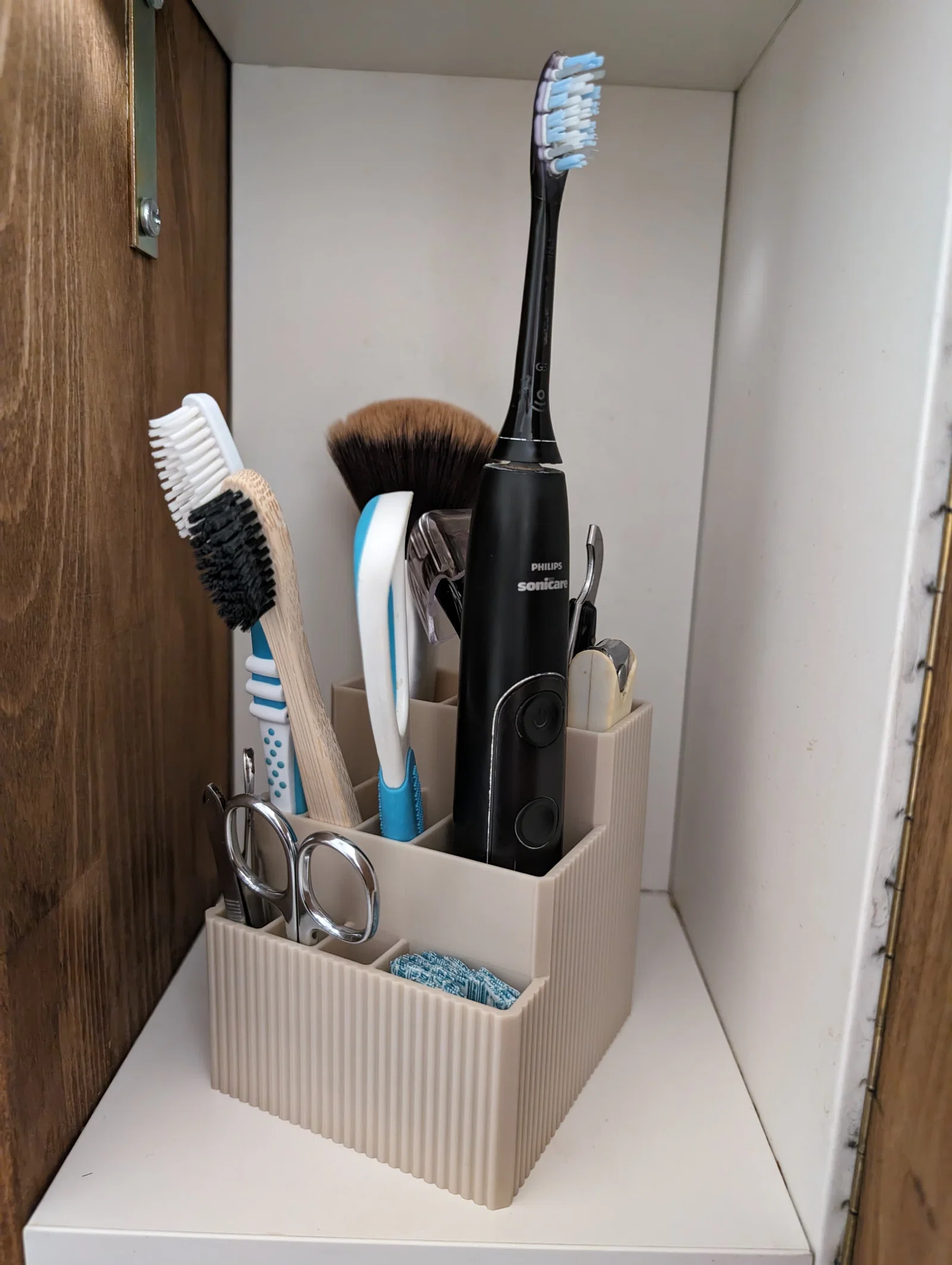 Kệ sắp xếp đồ phòng tắm nhỏ với 12 ngăn và có khay hứng nước (drip tray), thiết kế in không cần supports. Có 2 phiên bản normal và short (ngăn sau thấp hơn) để giảm chiều cao tổng thể.