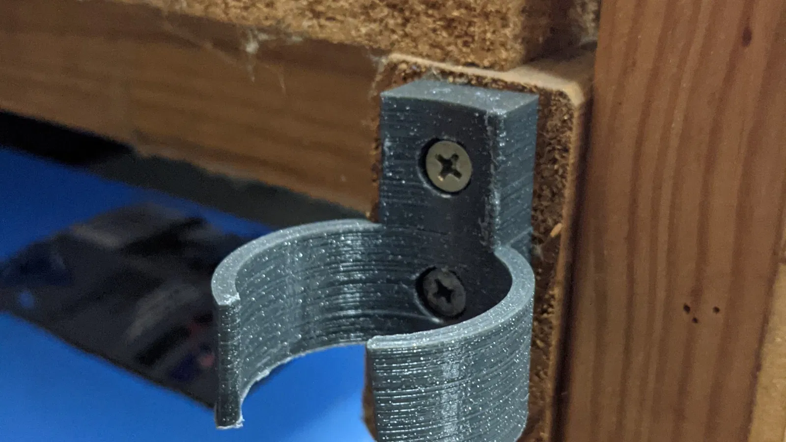 Đây là một giá treo rất đơn giản để treo khẩu súng khí nén ½ inch của tôi bên cạnh một đơn vị kệ. Nó phù hợp với bất kỳ thứ gì có đường kính khoảng ~37mm, với một lỗ mở ở phía trước để đưa ống hoặc cáp vào. Tôi sử dụng hai vít gỗ thông thường để cố định nó, và nó được in bằng ABS.