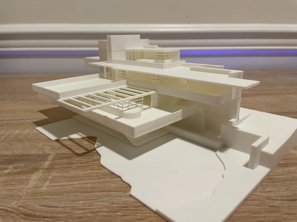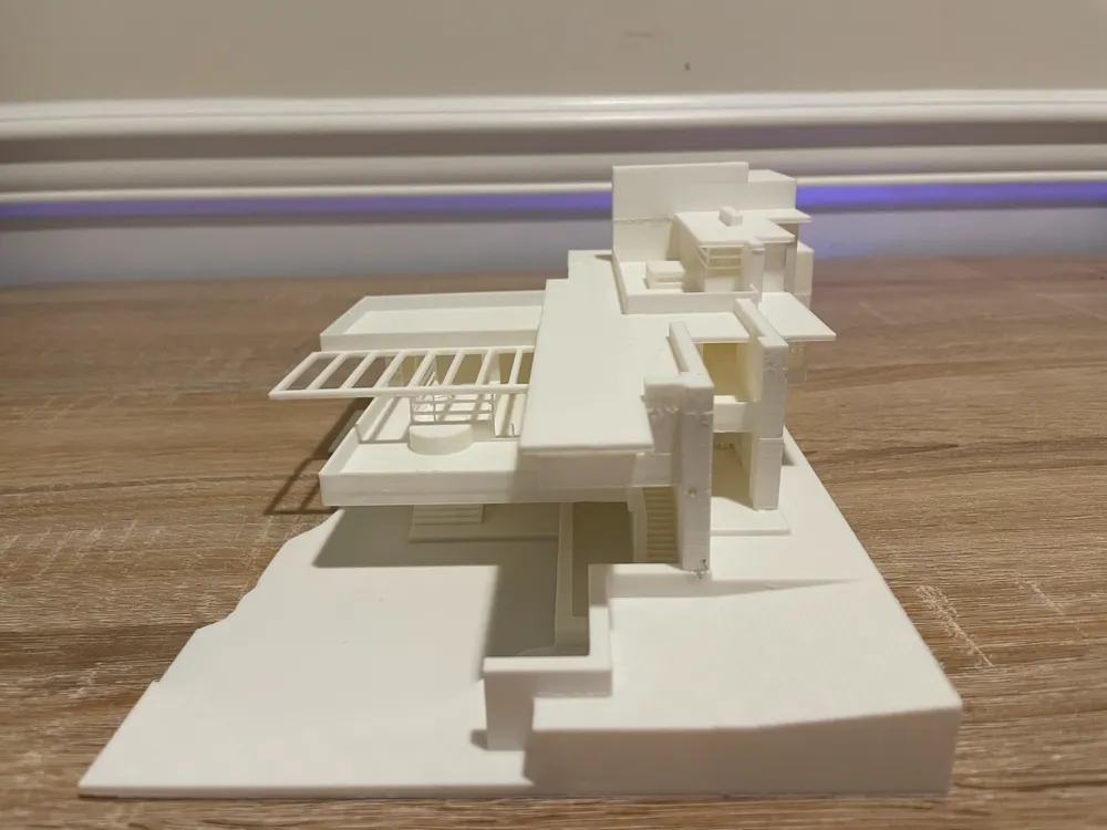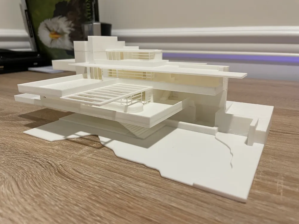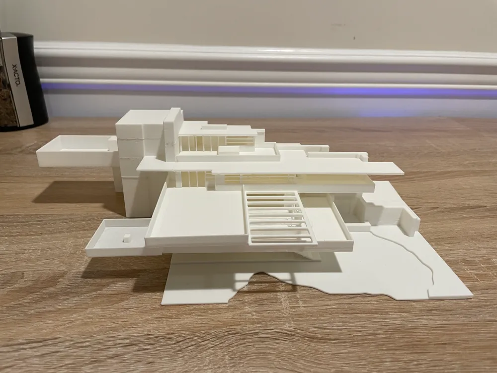Mô hình 3D Fallingwater của kiến trúc sư Frank Lloyd Wright – công trình nổi tiếng hòa quyện với thiên nhiên và thác nước. Có lưu ý in 3D về scale, tree supports, bridging speed và cách ghép mảnh bằng keo.