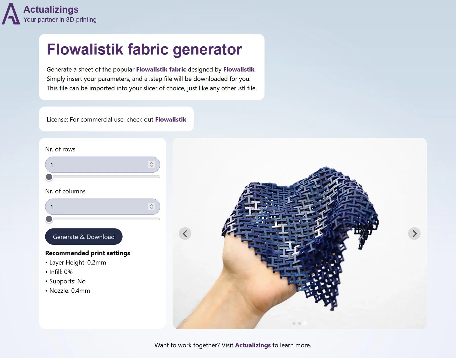 Tạo nhanh một tấm Flowalistik chainmail/fabric với kích thước tuỳ ý chỉ trong vài giây. Truy cập link generator, nhập thông số bạn muốn và xuất mẫu đúng size để đem đi in 3D ngay.