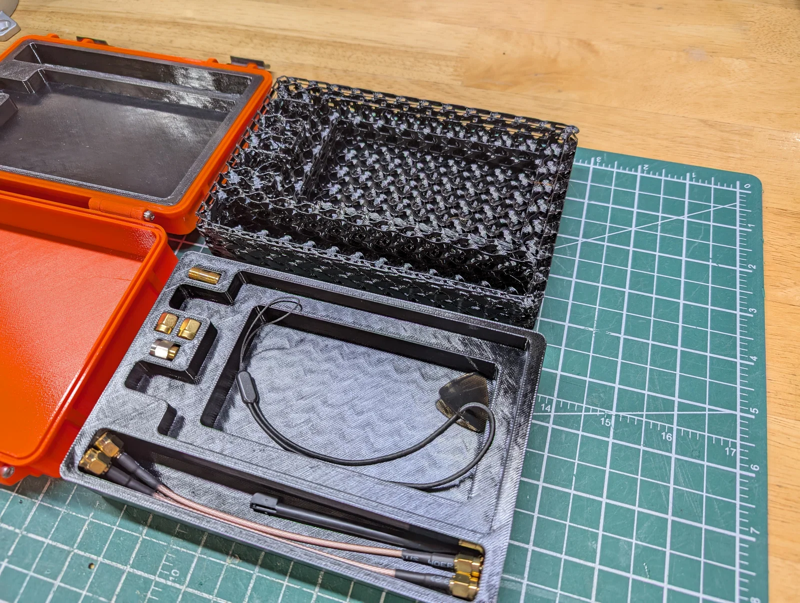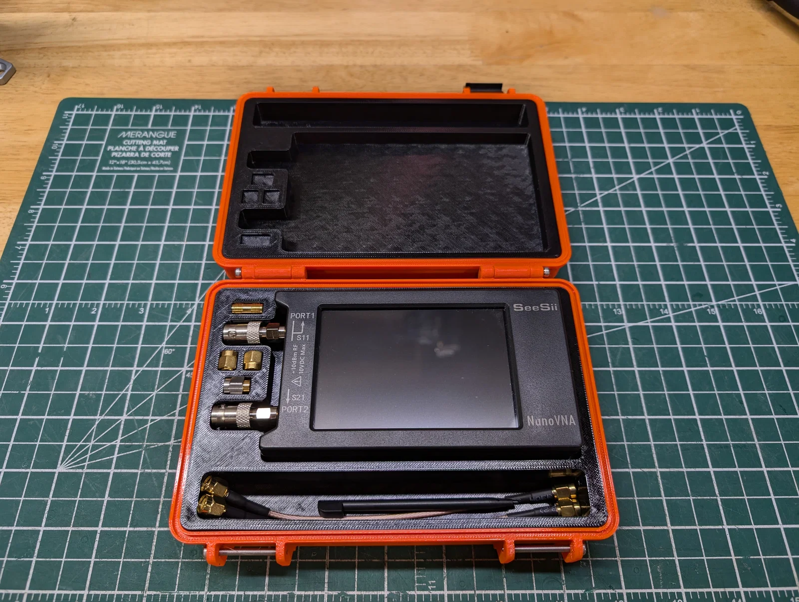 Hộp đựng cho NanoVNA-H4 của bạn. Có chừa khoảng trống ngay khu vực đầu nối SMA để bạn có thể để sẵn adapter trên VNA nếu muốn (mình gắn adapter BNC trên máy của mình). Hộp vừa các chuẩn hiệu chuẩn SMA (SMA calibration standards) và có nhiều không gian chứa đồ bên dưới NanoVNA cũng như trong một ngăn phụ kiện.