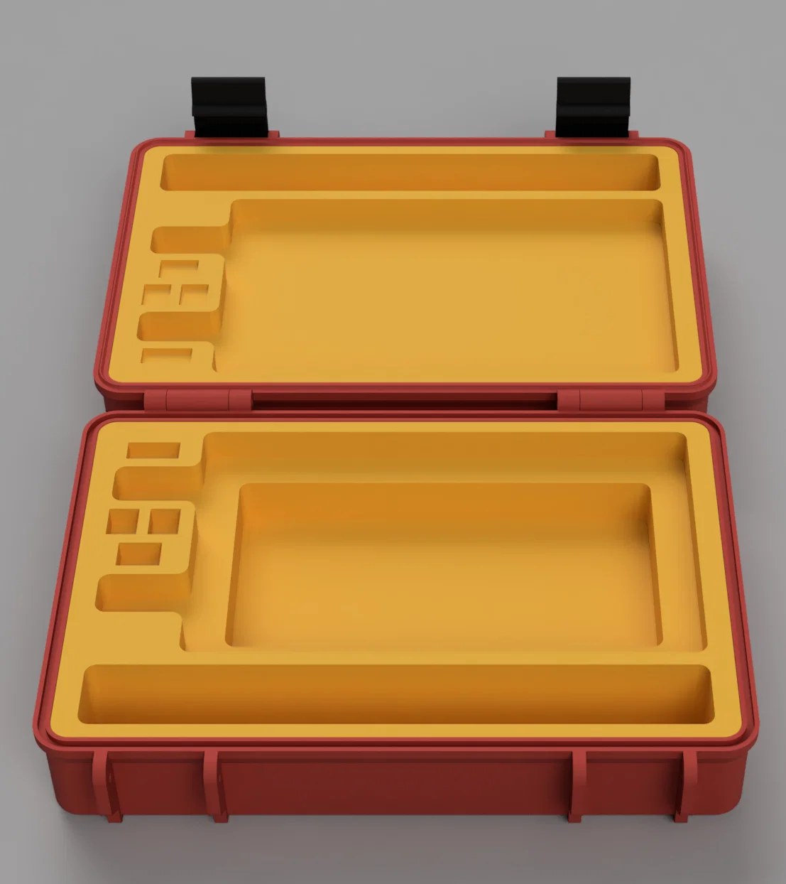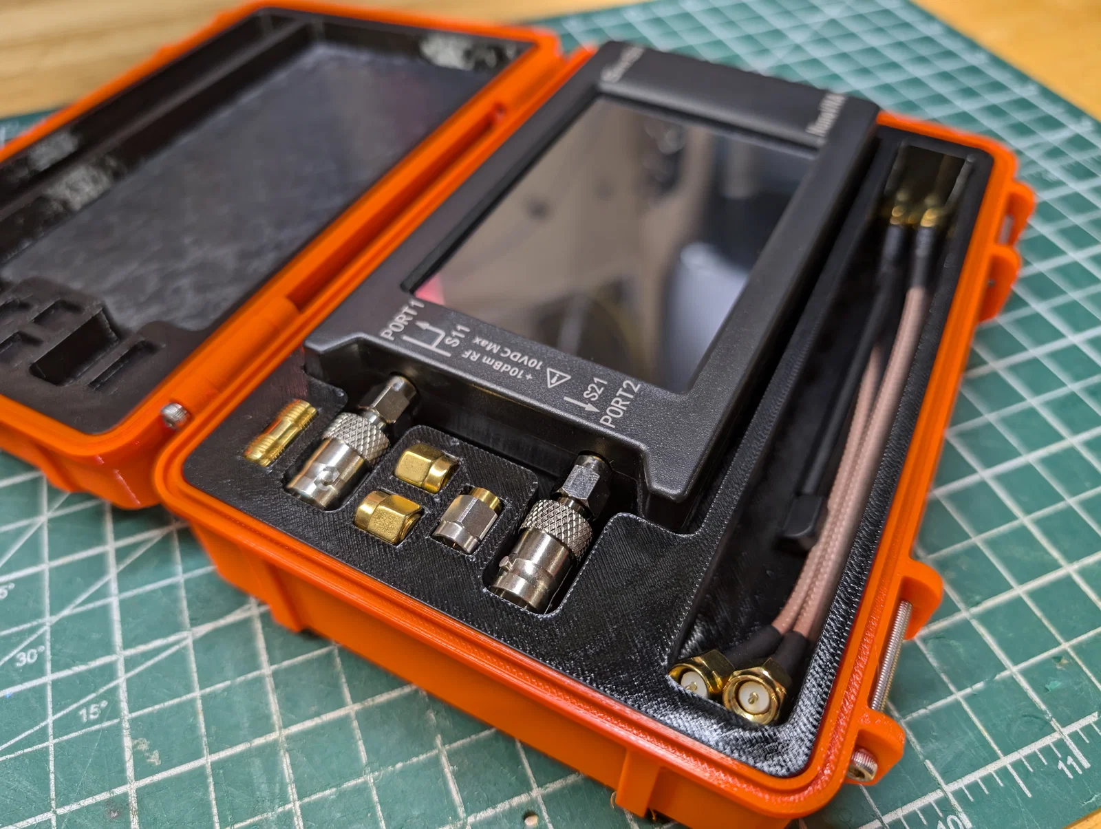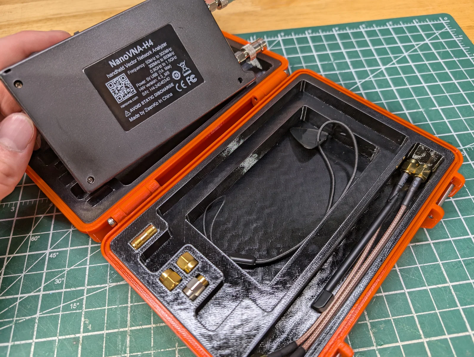 Hộp dã ngoại (rugged) cho NanoVNA-H4, chừa chỗ ở đầu SMA để gắn sẵn adapter (ví dụ BNC), vừa bộ SMA calibration standards và có nhiều ngăn chứa phụ kiện bên dưới máy và một khe phụ kiện riêng.