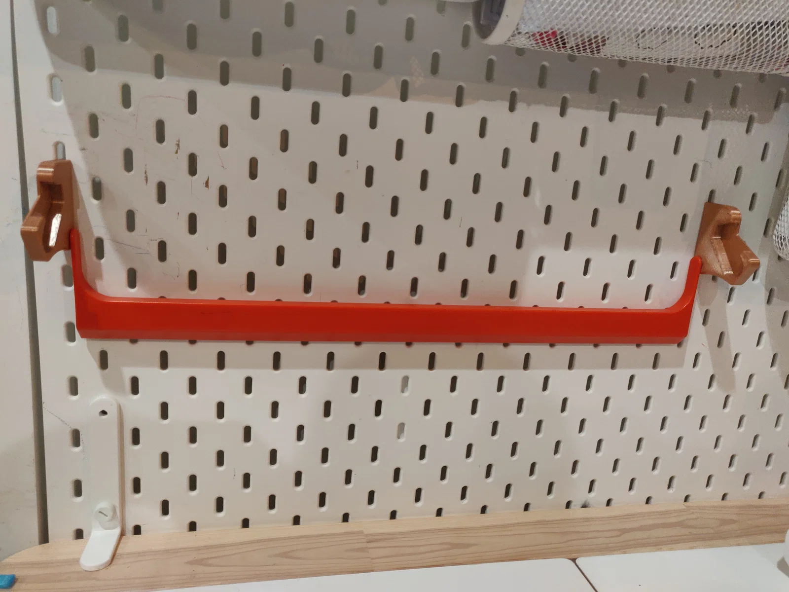 Bộ ngàm chuyển đổi gọn nhẹ cho IKEA MÅLA Paper Roll Holder: tháo khung gỗ cồng kềnh, dùng lại thanh dowel và lưỡi cắt nhựa nguyên bản để gắn trực tiếp lên SKÅDIS pegboard hoặc bàn FLISAT.