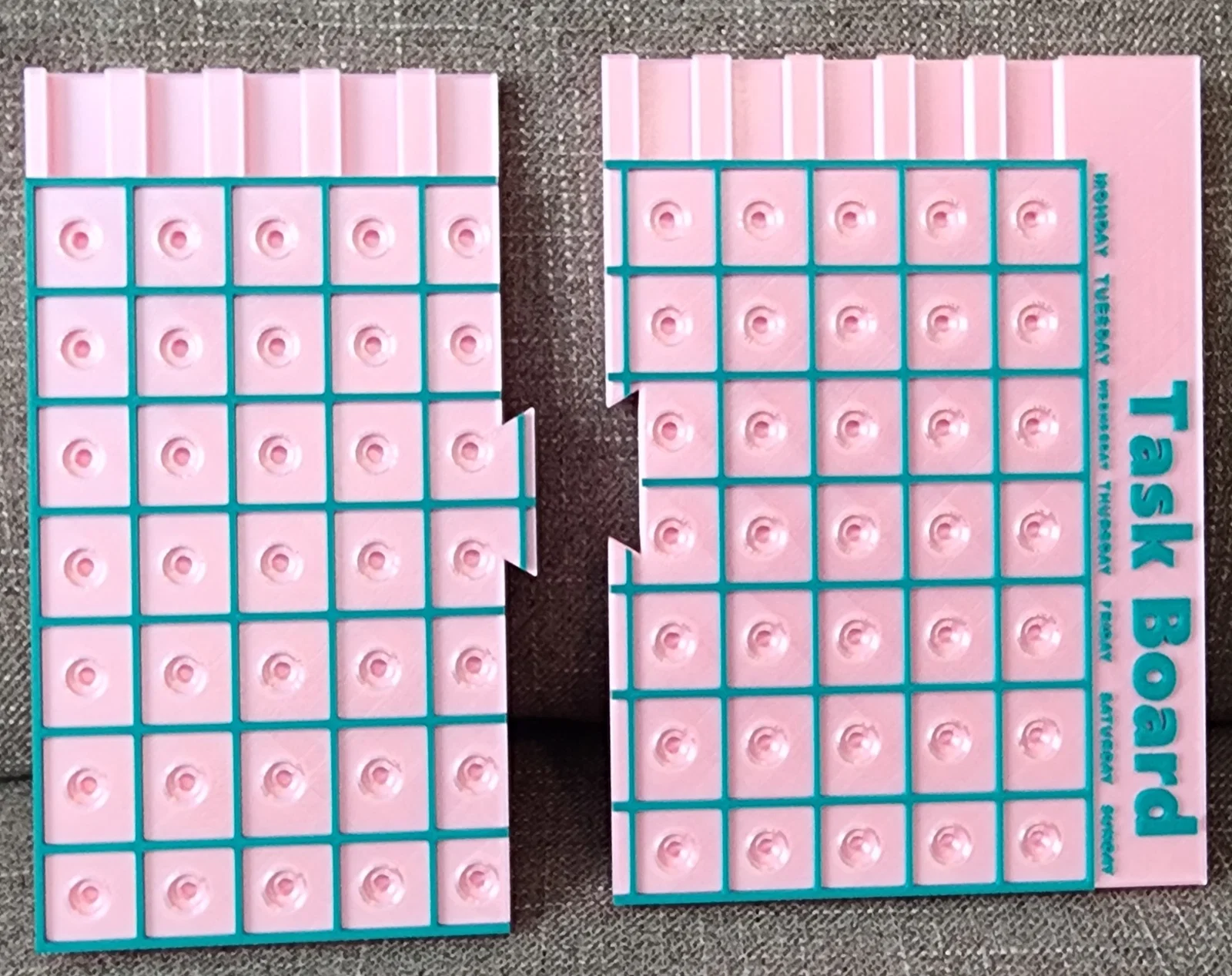 Bảng pegboard theo dõi nhiệm vụ/việc nhà cho bé, dạng lưới theo tuần (Thứ Hai–Chủ Nhật). Có 10 tab có sẵn và tab trống để tự thêm chữ trong slicer. Board lớn, tách đôi bằng dovetail trong PrusaSlicer.