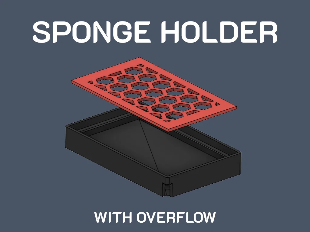 Kệ đựng sponge giúp thoát nước và nhanh khô, có phần tràn khi nước trong kệ quá nhiều. Phù hợp miếng sponge 9 cm x 5,5 cm; đáy kệ 6,5 cm x 10,5 cm. In thử trên Bambu P1S với PLA.