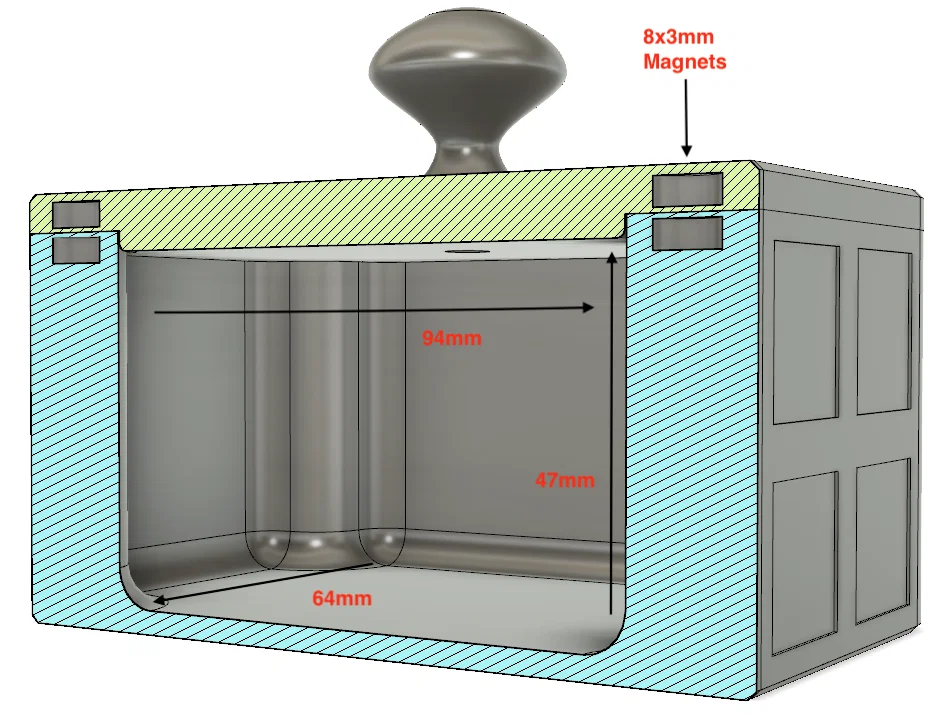 Một chiếc hộp nhỏ xinh xắn kèm nắp hít nam châm cực kỳ tiện lợi để đựng các món đồ nhỏ. Thiết kế thông minh, dễ in, không cần hỗ trợ. Mẫu này sử dụng nam châm 8x3mm và ốc M3X20mm, phù hợp để đựng linh kiện, trang sức hoặc pin.