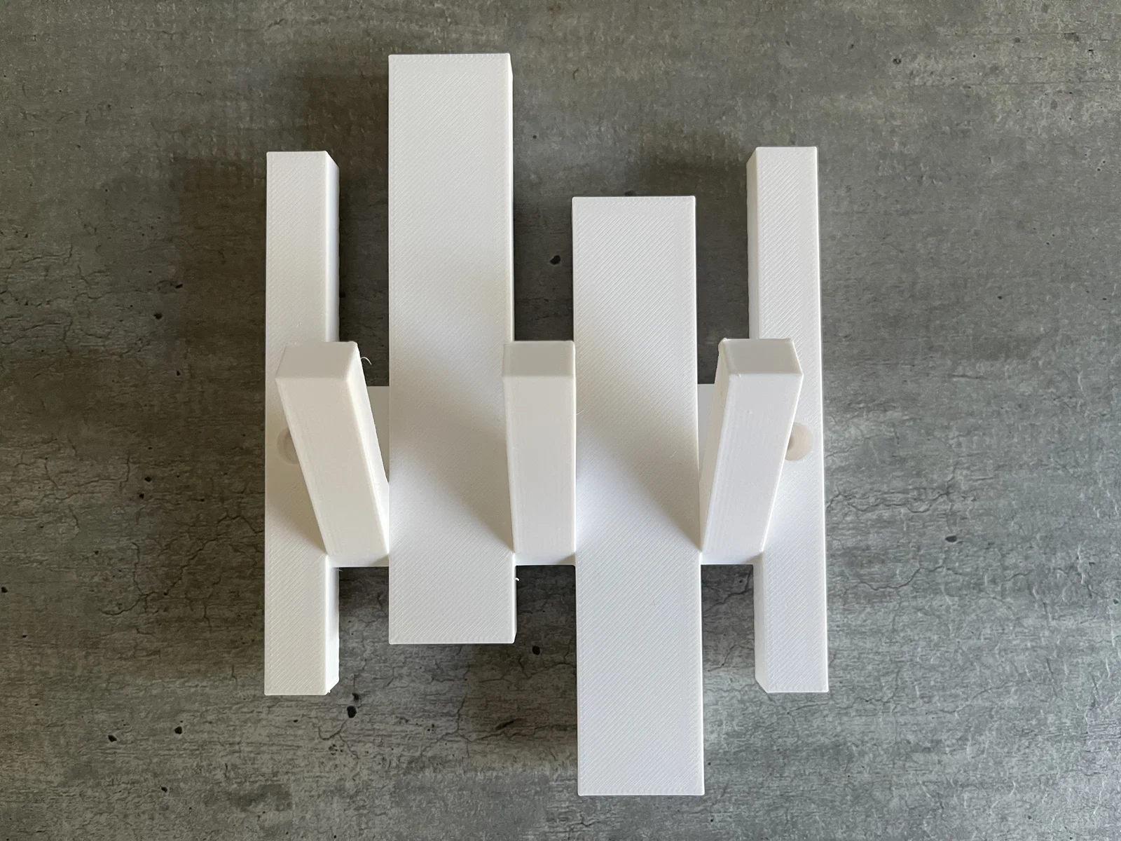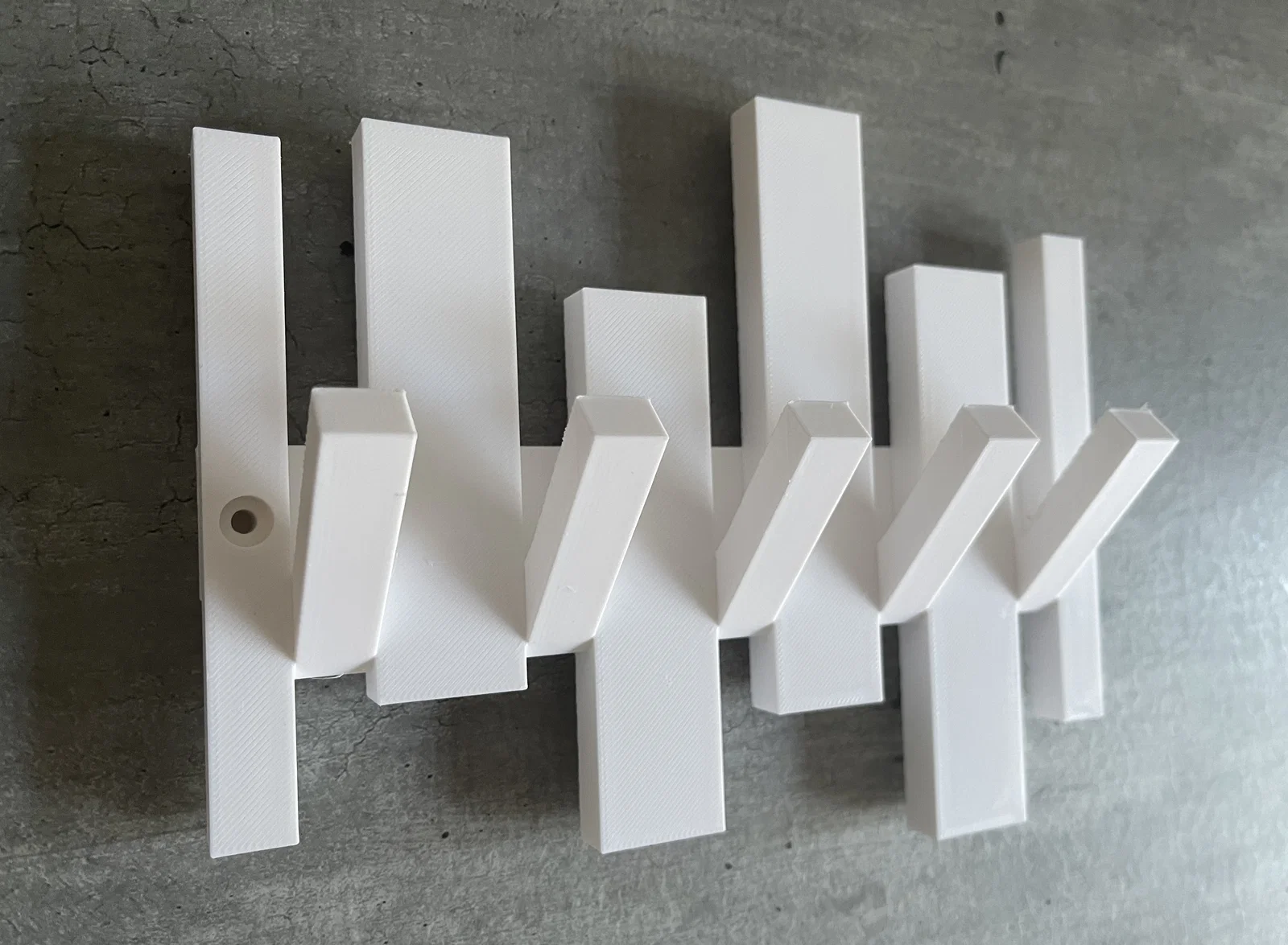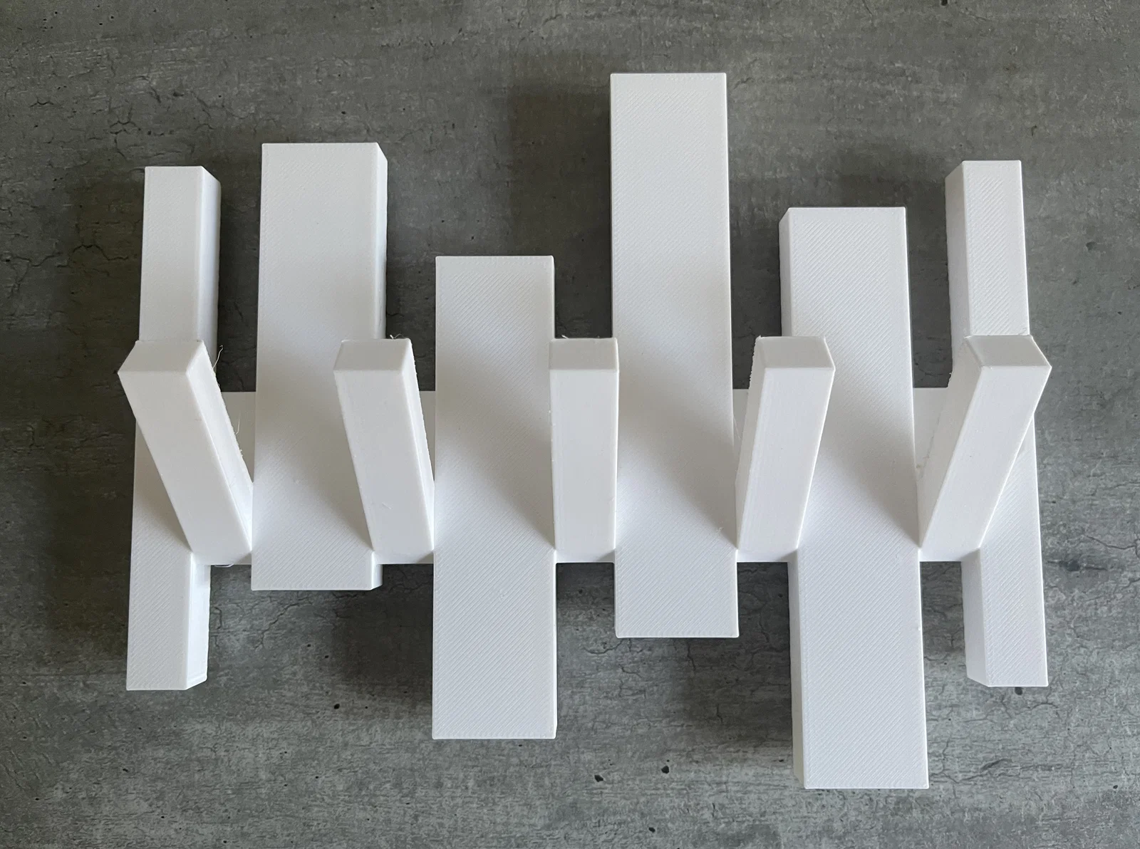 Móc treo tường thiết kế đơn giản mà hiện đại, có lựa chọn bản 5 móc hoặc 3 móc. Mẫu in thử bằng PLA trắng. In 2 lớp đầu không có lỗ vít nên không cần raft; phần phẳng cần supports, móc nghiêng 45°.