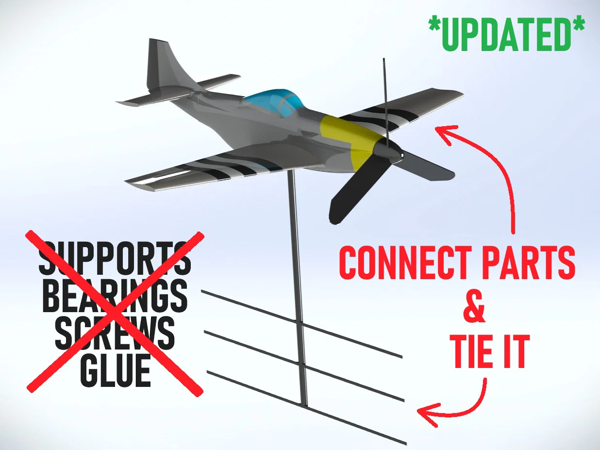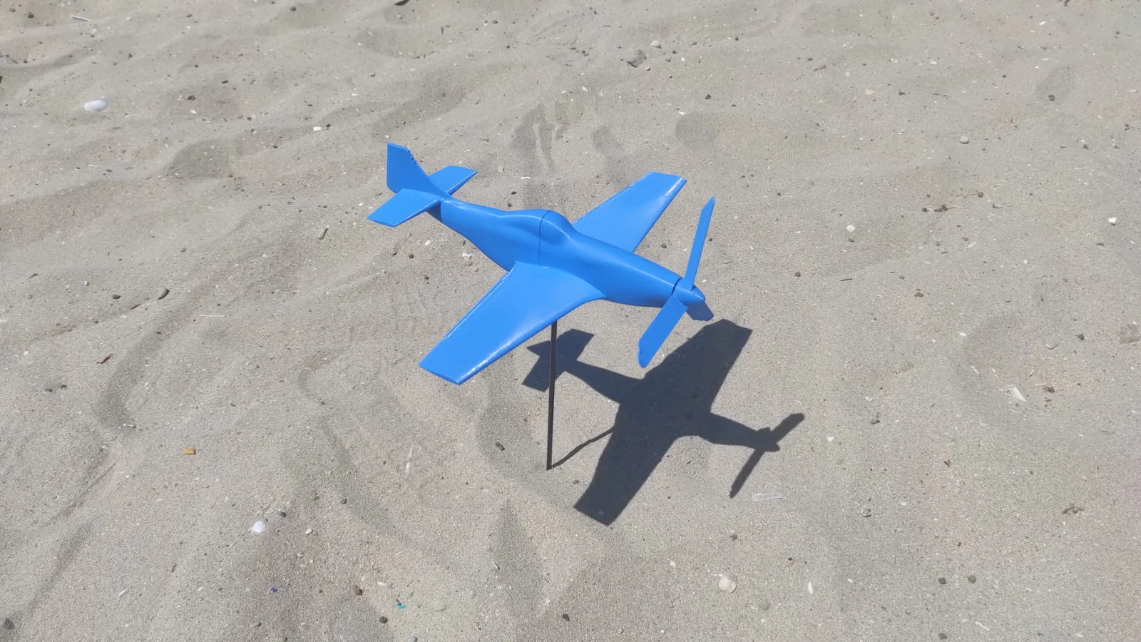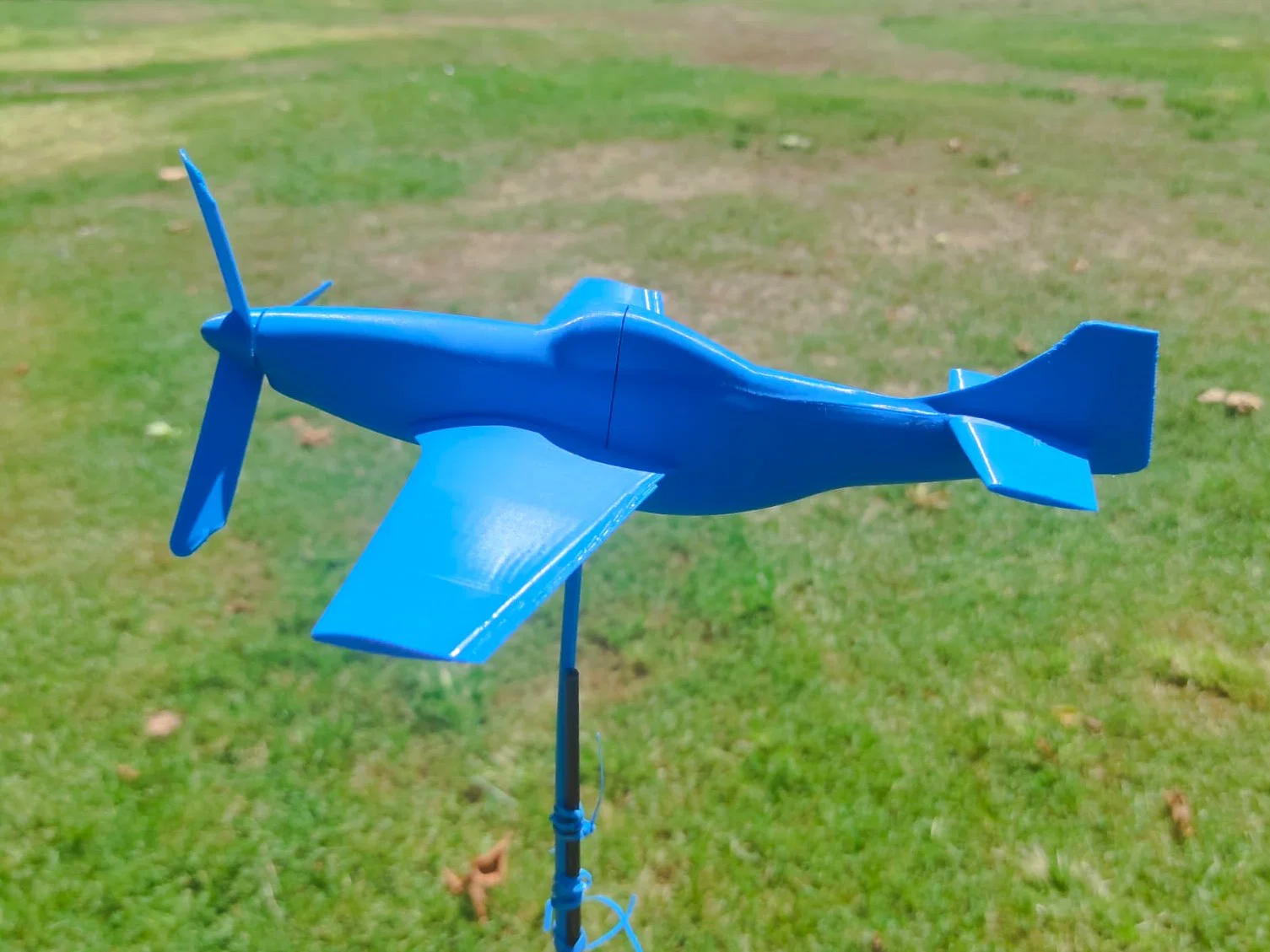 Mẫu P-51 MUSTANG WIND SPINNER: in xong rồi nối các phần lại, buộc/treo ở đâu cũng được cho gió quay. Thiết lập in đơn giản (infill 5%, không support/brim), lắp ráp nhanh, phù hợp trang trí sân vườn.