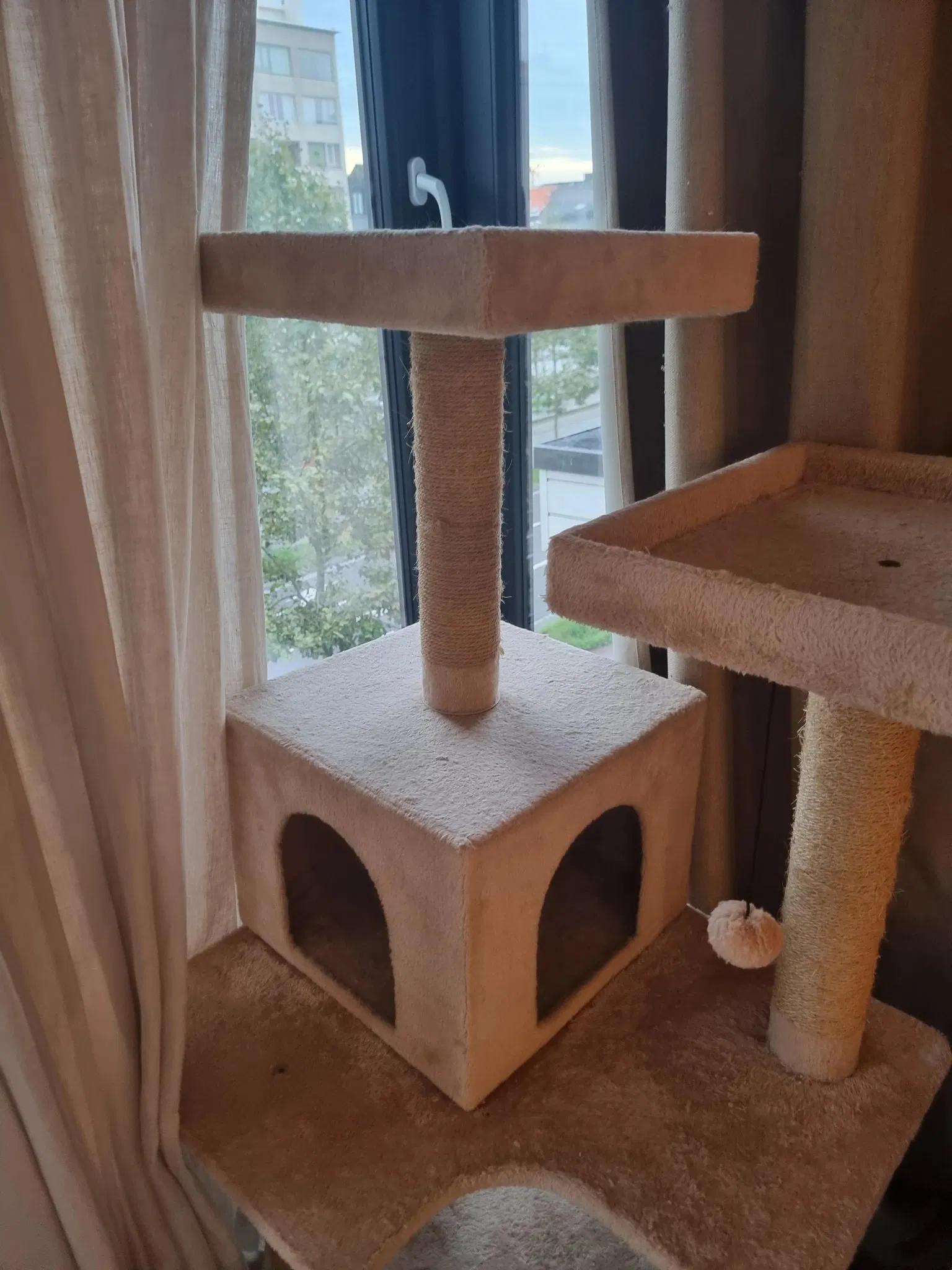 Mèo của tôi đã tấn công cột cào của chúng một cách hung hãn đến nỗi tấm ván ép khá yếu đã bị rách và chiếc giường trên cùng đã rơi xuống.