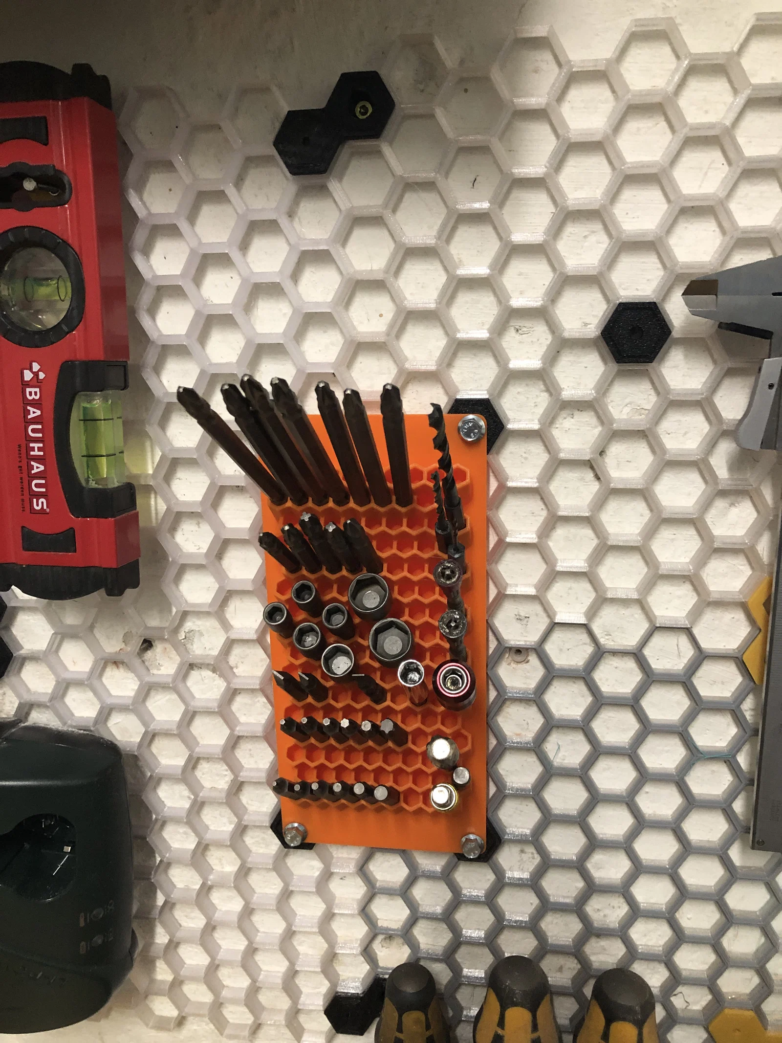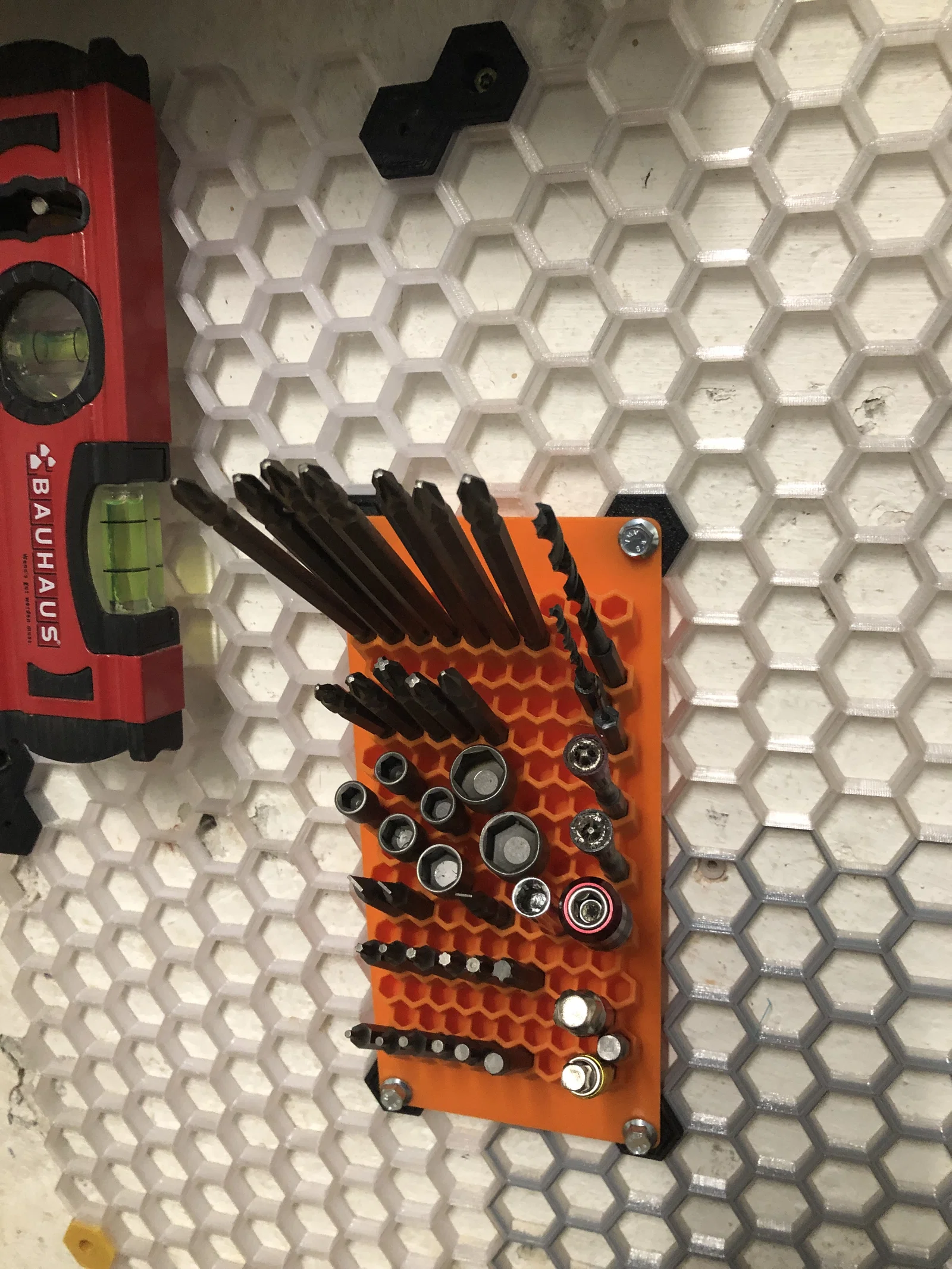 Bản remix của bit holder để dùng với hệ Honeycomb Wall Storage. Mình thêm mounting plate có lỗ để bắt vít, dùng 4 vít M5 + 4 ê-cu M5 và in 4 mẫu “insert M5.stl” để gài vào honeycomb wall.