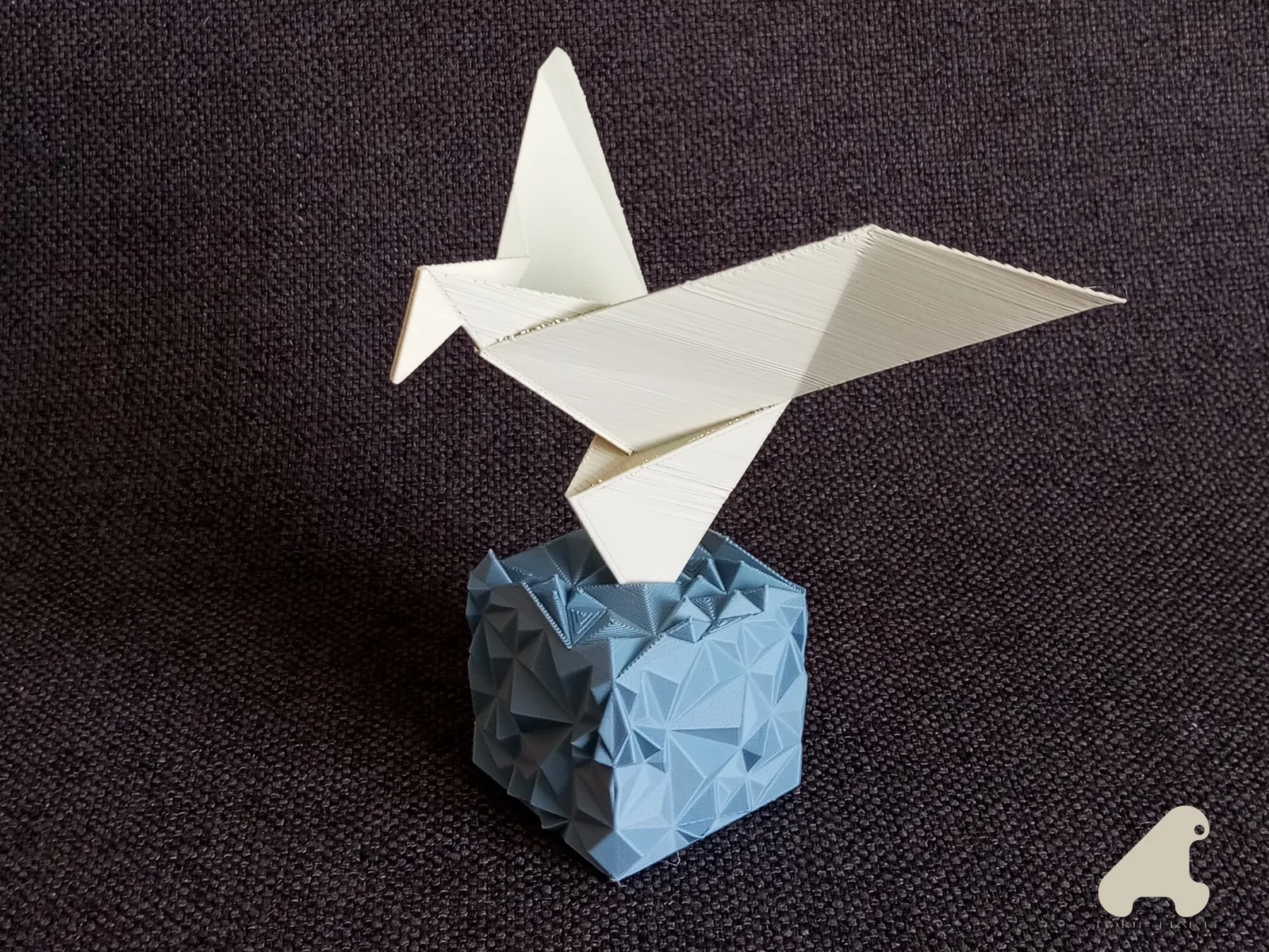 Mẫu OISEAU ORIGAMI là chim phong cách origami kèm bệ cùng thiết kế, dùng trang trí nội thất. File STL sau khi lắp ráp cao khoảng 14 cm, bạn có thể scale để in theo kích thước mong muốn; chỉ cần một chấm keo để dán chim với bệ.