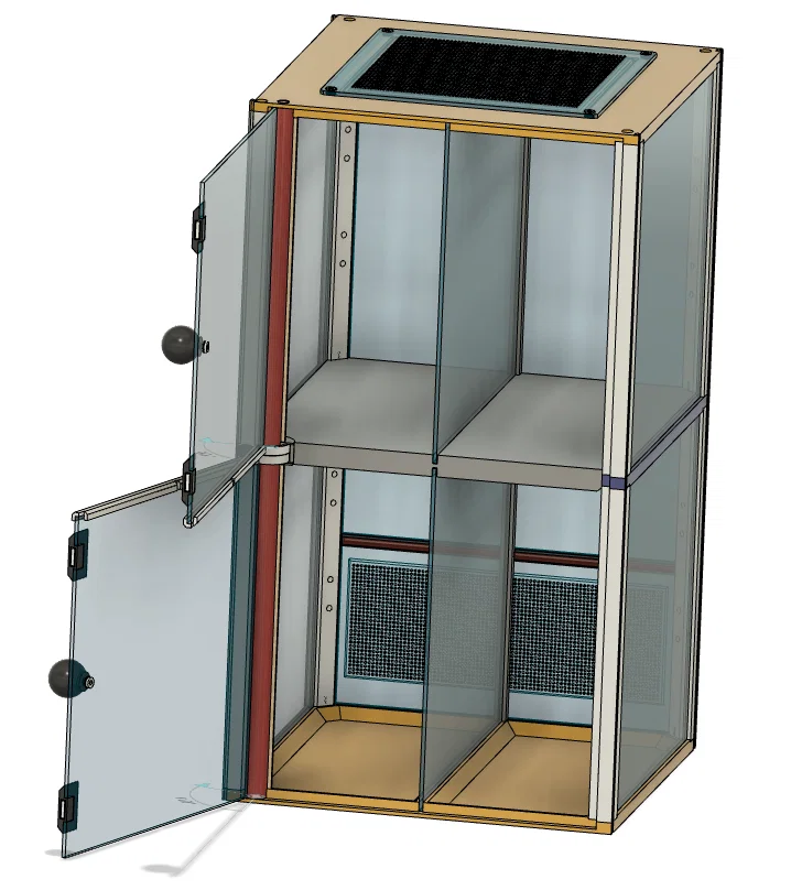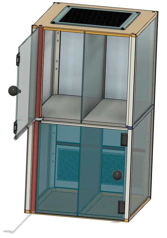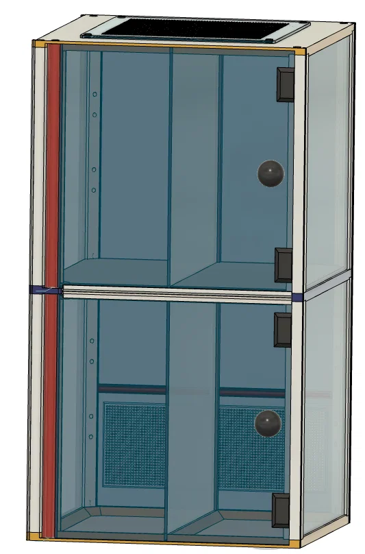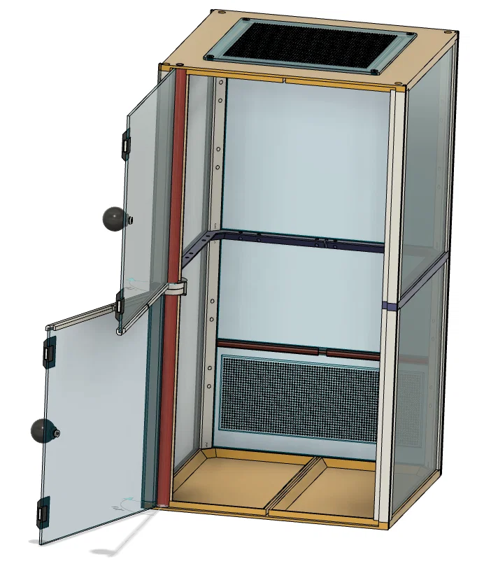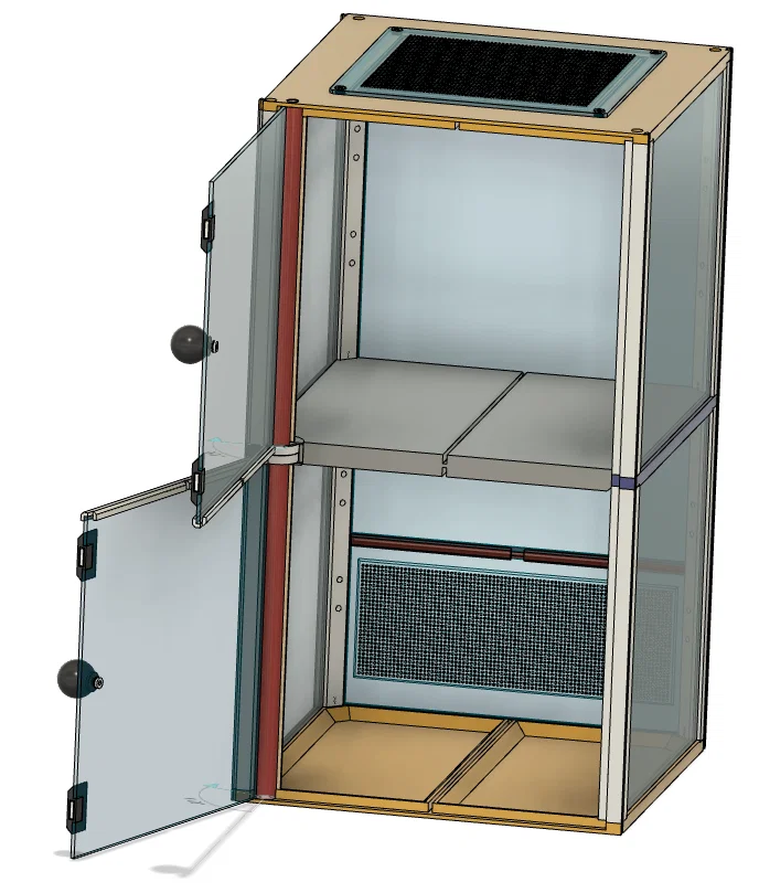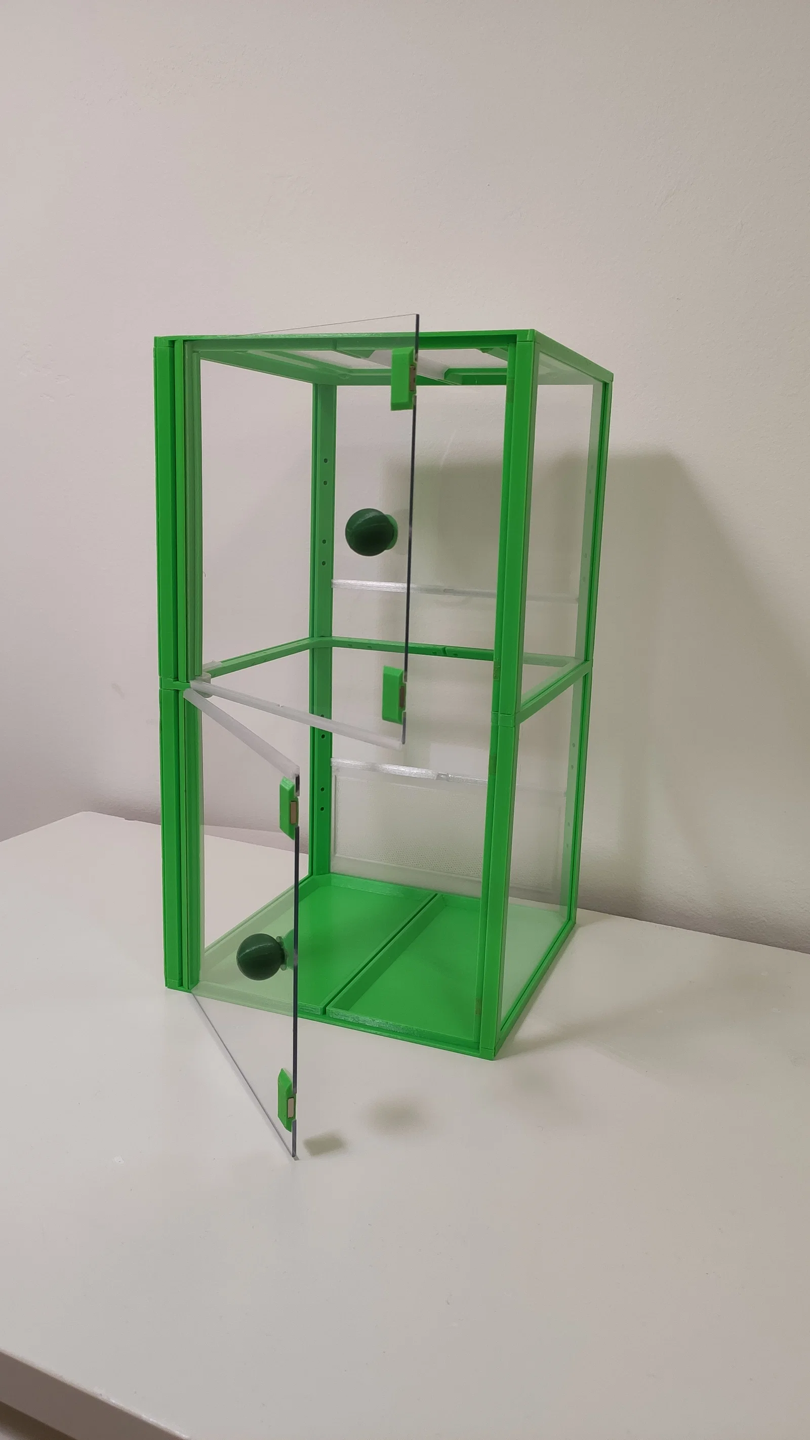 Terrarium/Insectarium dạng modular kích thước 200×200×365 mm. Có thể in nửa chiều cao hoặc chia 2/4 (thậm chí 3) phần. File hỗ trợ gcode, *.3mf và *.STEP; khuyến nghị PETG cho phần chịu lực, PLA cho phần còn lại.