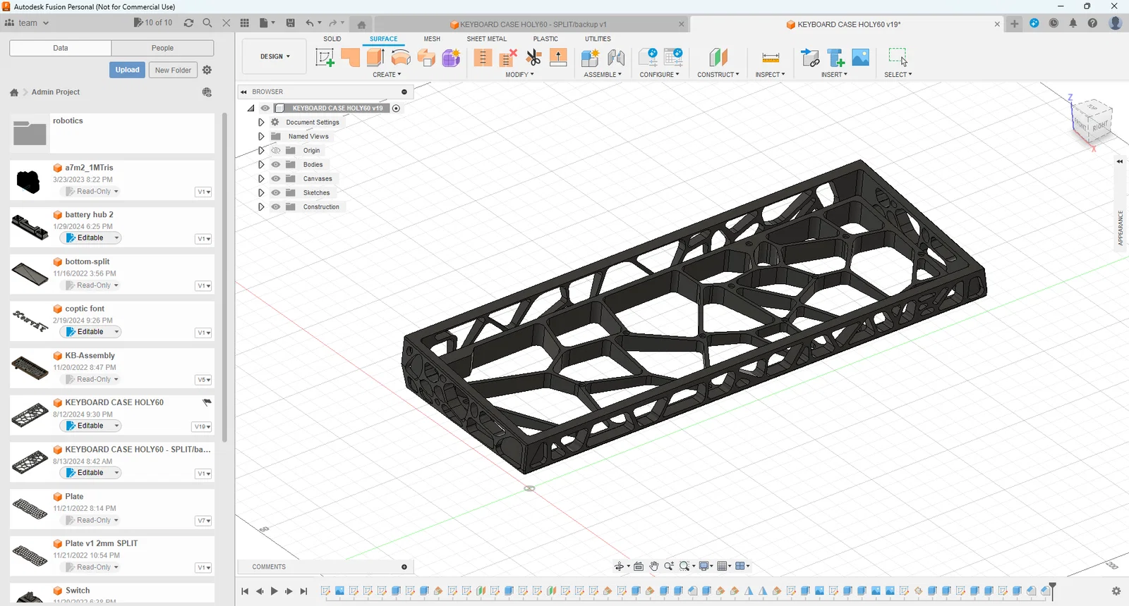 Đây là phiên bản mình làm lại của case holy60 từ KBDfans. Mình muốn build một bộ phím với kiểu case này nhưng thấy giá khá chát, nên mình nghĩ thử dựng lại để có thể in 3D được. File CAD chính là bản liền (chưa split), nhưng để vừa với đa số bàn in (mình dùng MK3S+), mình chia nó thành 2 mảnh để có đủ khoảng trống in kèm supports, rồi sau khi in xong mình sẽ dán 2 phần lại bằng keo 502/superglue (tới giờ dùng với mình vẫn ổn).