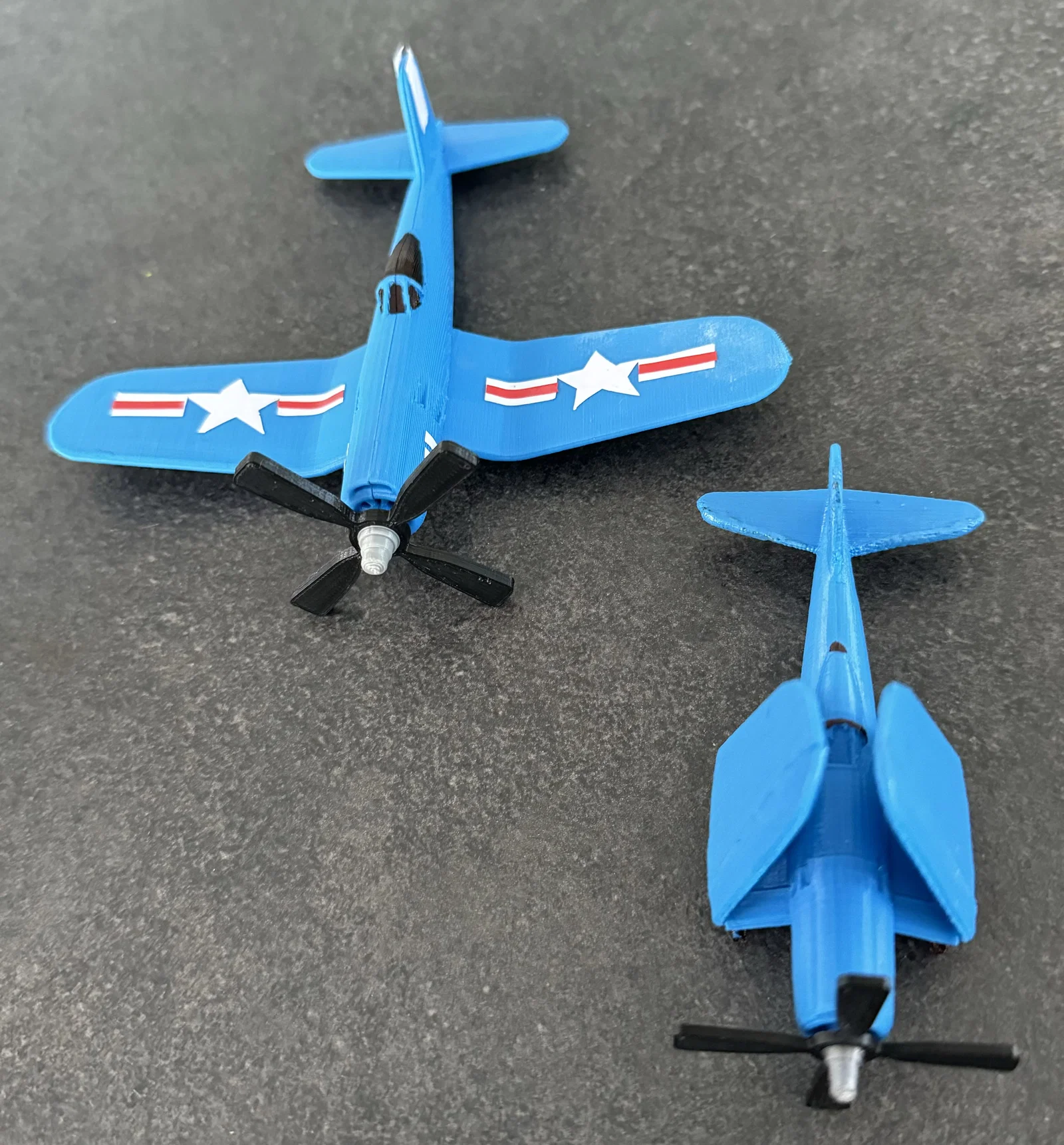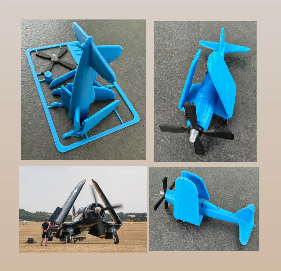 Mẫu Corsair F2G với cánh gập dạng kit card. Có thể in chung hoặc in rời để đổi màu; cần support và sẽ phải dán keo/lắp ráp. Trên profile còn có phiên bản máy bay gập cánh nguyên chiếc.