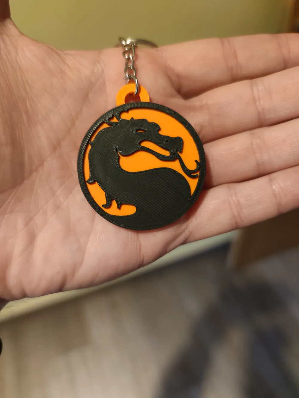 Mẫu móc khóa KeyChain Mortal Kombat dễ in, hỗ trợ in nhiều màu. In màu cam đến 2.1 mm rồi đổi sang đen. Thiết lập infill 20%, không cần supports; tha hồ đổi màu theo sở thích.