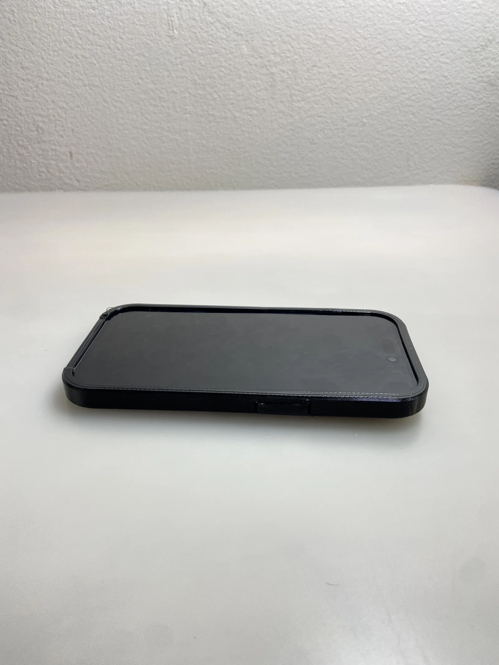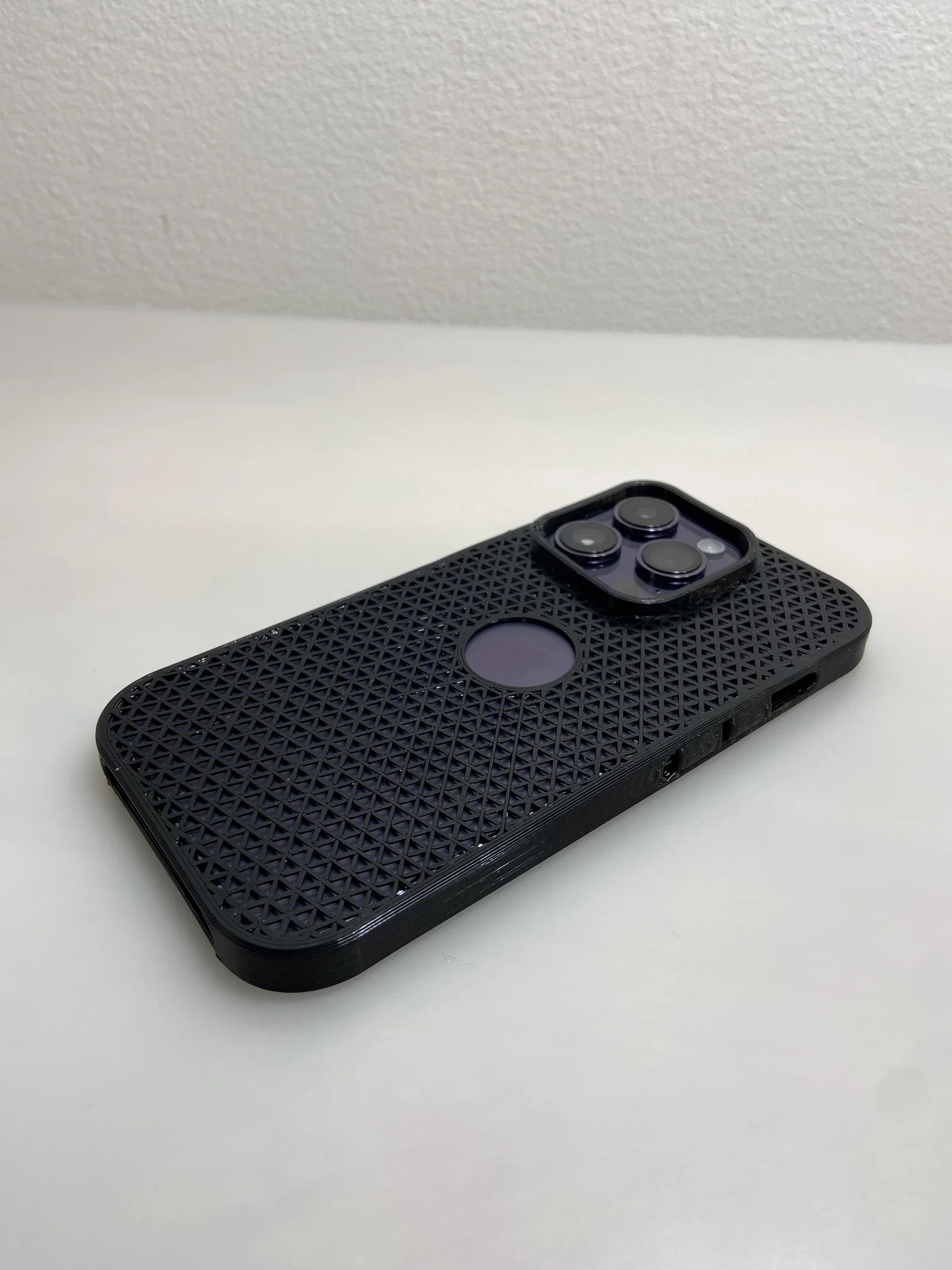 Mẫu ốp lưng iPhone 14 Pro, in TPU với nozzle 0.6mm. Hướng dẫn dùng slicer tạo hoạ tiết bằng infill-only (không top/bottom layer ở đáy), kèm modifier cho mép bên. Có thêm miếng “buffer” bảo vệ camera bump và file Fusion.