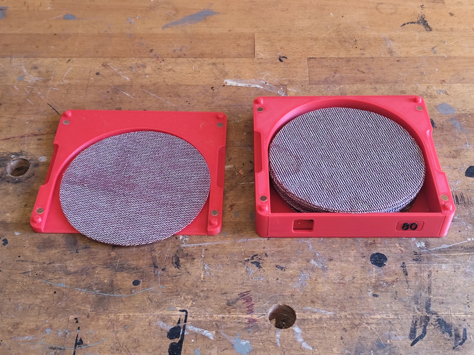 Hệ lưu trữ sanding disc modular, treo tường được và fully parametric. Tách riêng disc “đang xài” khỏi xấp disc còn mới, có cửa che, nhãn grit nam châm, cửa sổ xem còn bao nhiêu. Gắn module bằng nam châm 6x2mm.