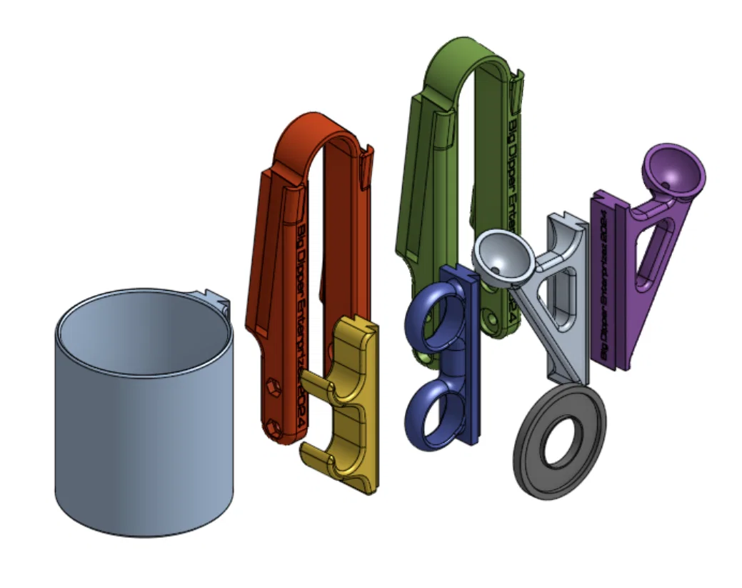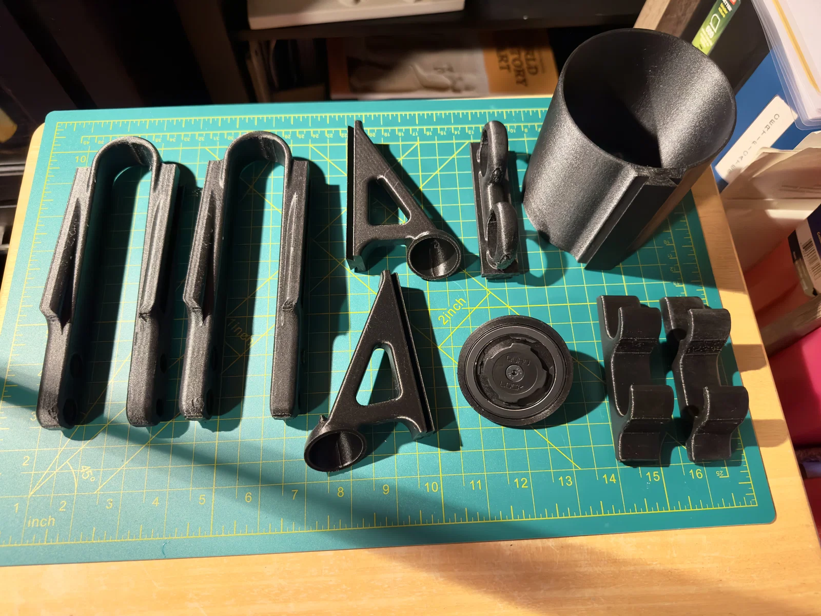 Bạn sẽ cần dùng supports để in tất cả mọi thứ, trừ cái cup holder. Mình đã in bằng cả supports thường và tree supports. Bạn tự cân nhắc cái nào hợp máy/hợp setting của bạn nhất. Các chi tiết được vẽ trên OnShape. Mình sẽ kèm file STEP nếu bạn muốn chỉnh sửa. Mình in bằng PET-CF, 25% Gyroid Infill, 4 Wall Loops, không Brim, và layer 0.2mm. In theo phương thẳng đứng, để phần ngàm trượt (slide attachment) không nằm sát mặt bed là tốt nhất, vì độ khít rất sát và không chịu được méo/distortion nhiều.