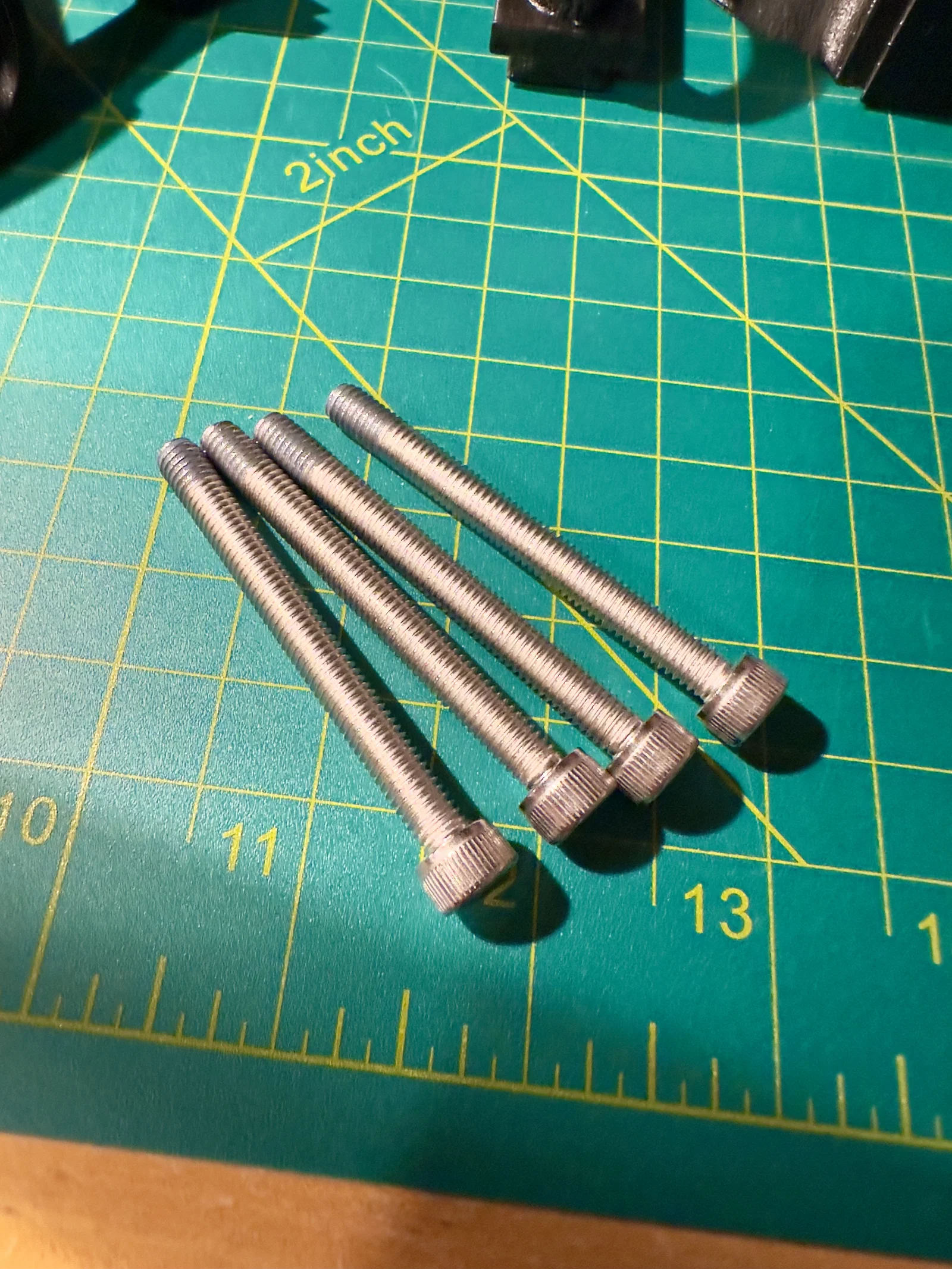 Bạn sẽ cần 4 con bulông M6 x 60mm, bước ren 1.0 (1.0 Thread Pitch) loại Socket Head. Dùng shoulder bolt thì tốt nhất, nhưng mình không kiếm được đúng size. Có thể tái sử dụng lại đai ốc (nuts). Chấm một chút Blue Threadlock lên bulông, nhưng nhớ để nó khô rồi hãy lắp ngàm, vì thread lock có thể làm tan một số loại nhựa. Lúc ráp đừng nản nha; bạn cần tỉa/cắt gọn chỗ supports bám thật kỹ, vì mọi thứ trong mẫu này đều làm theo dung sai chặt (đúng ra phải vậy). :-)