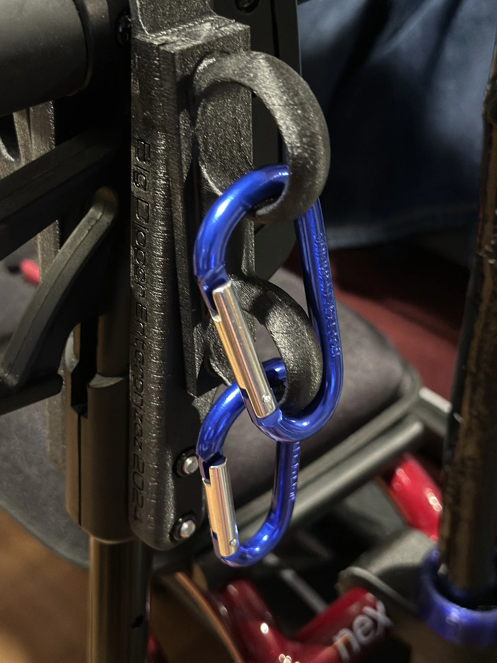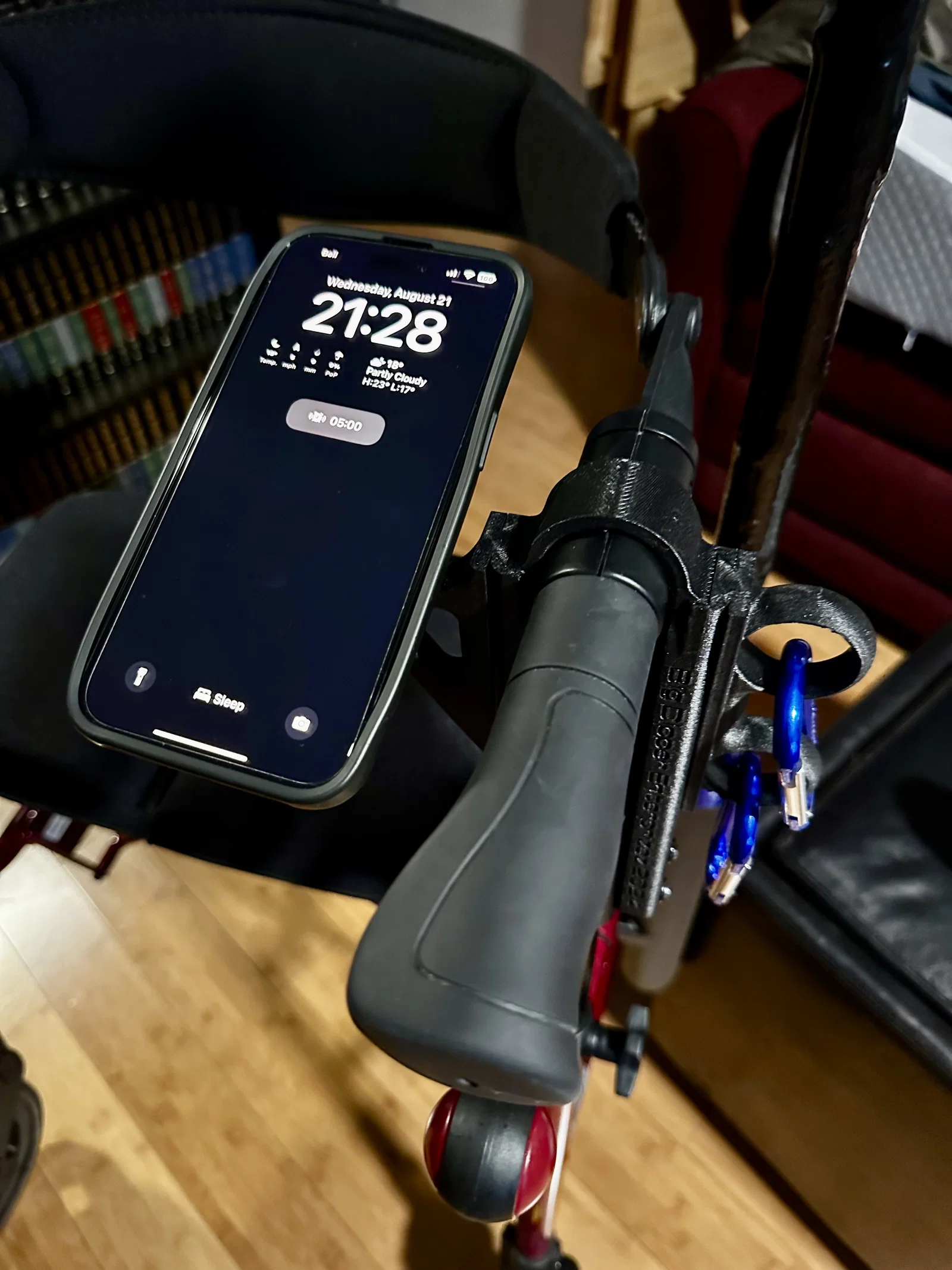 Mình đã thiết kế một cặp adapter để gắn vào hai bên xe lăn/khung tập đi NEXUS Rollator/Walker, nhằm cho phép gắn thêm bất kỳ món nào dùng kiểu ngàm lắp “dovetail style”. Mình có kèm theo: một Cup Holder, một móc treo túi đi chợ, một vòng treo carabiner, và một ngàm để gắn phần gimbal của bộ Quad Lock iPhone Case Mount. Bạn sẽ cần gimbal mount và núm vặn (knob) từ Quad Lock (xem hình). Mình dùng vòng nam châm màu đen từ ốp Quad Lock, rồi thay bằng vòng màu xanh. Vòng nam châm (mag ring) là dạng press-fit vào adapter Quadlock Magnetic Mount. Nhớ canh đúng cực (polarity). Phần gimbal mount cũng là press-fit vào lỗ ở giữa của adapter điện thoại. Nếu bạn không dùng Quad Lock, bạn phải tự làm ngàm gắn điện thoại của riêng bạn. Gắn hết mấy món này vô là sẵn sàng “chiến” mọi tình huống luôn!