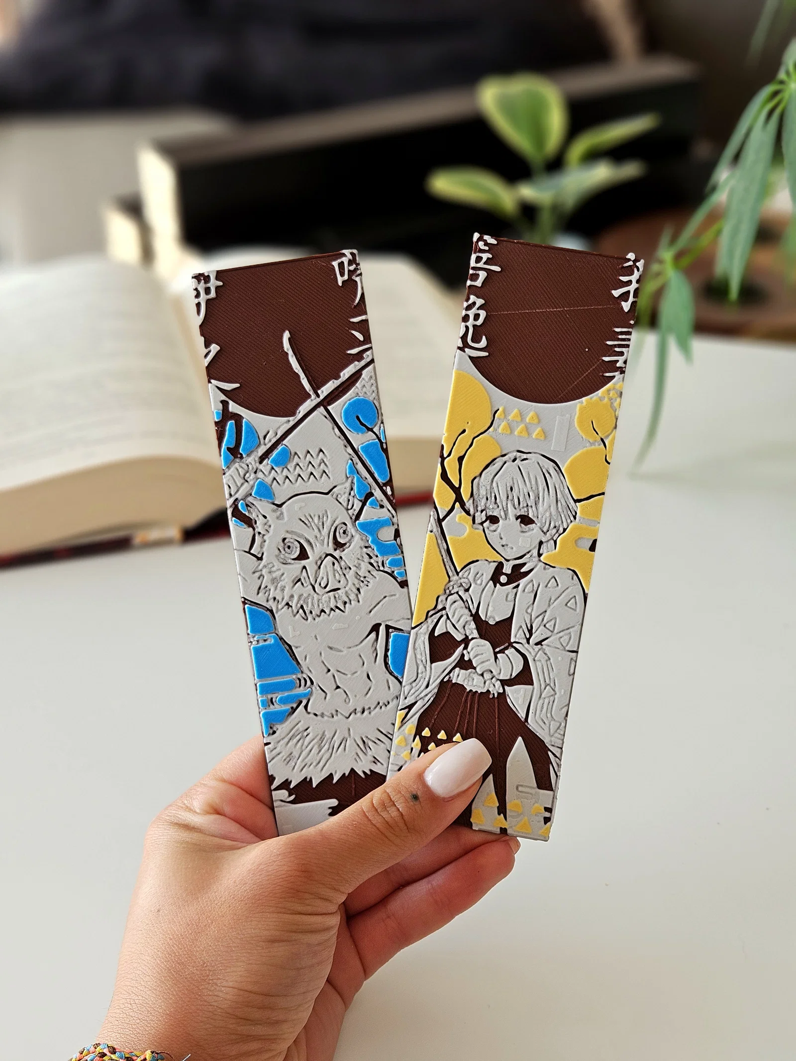 Bộ bookmark 2D/2.5D chủ đề Demon Slayer: Kimetsu no Yaiba gồm Inosuke và Zenitsu. In đẹp với nozzle 0.2 (0.4 vẫn ổn), đổi màu theo layer để tiết kiệm filament. Khuyến nghị in 100% infill.