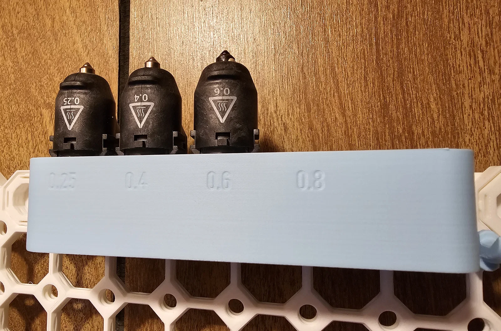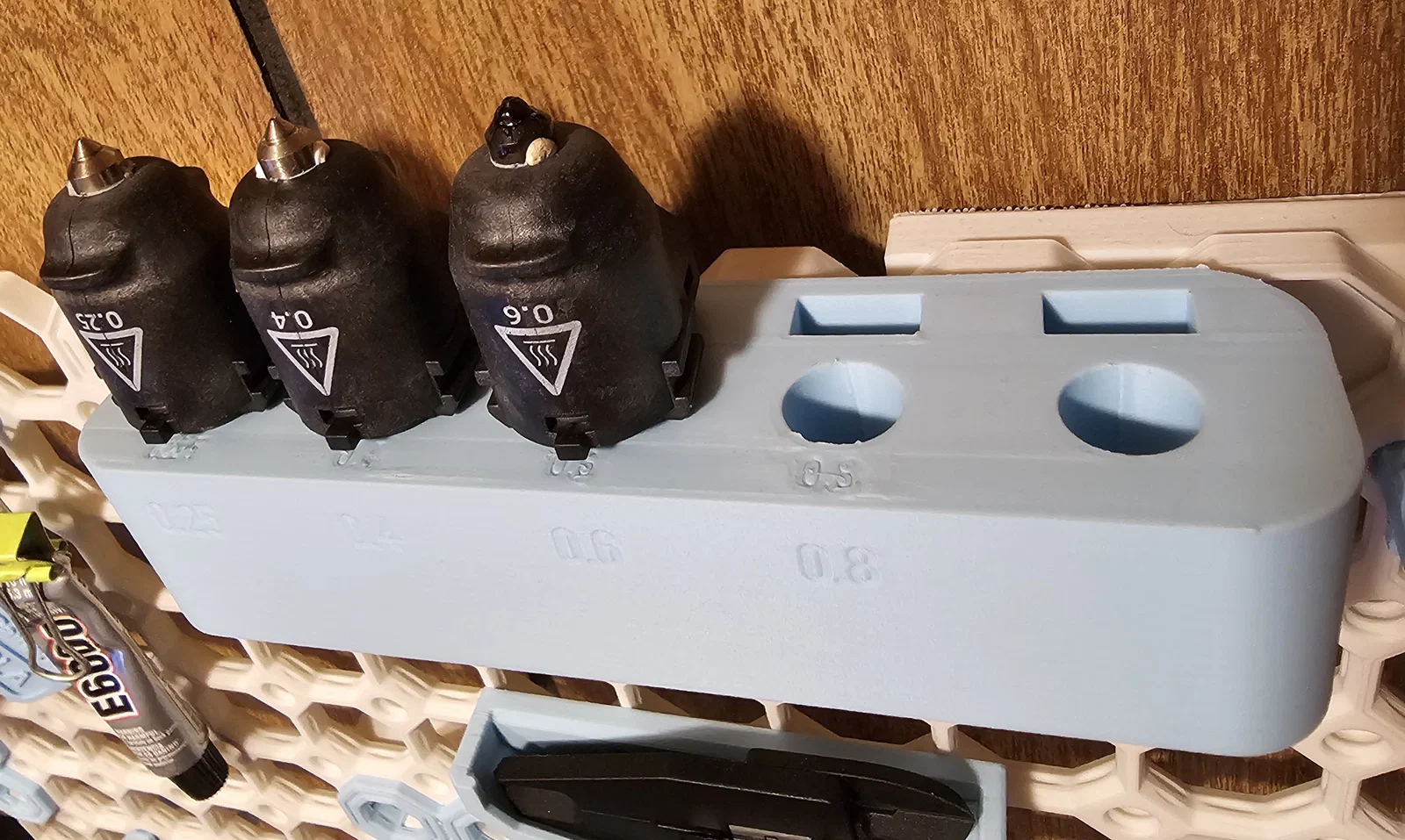 Có chỗ cho nozzle .25, 0.4, 0.6, 0.8 và thêm 1 ô trống.