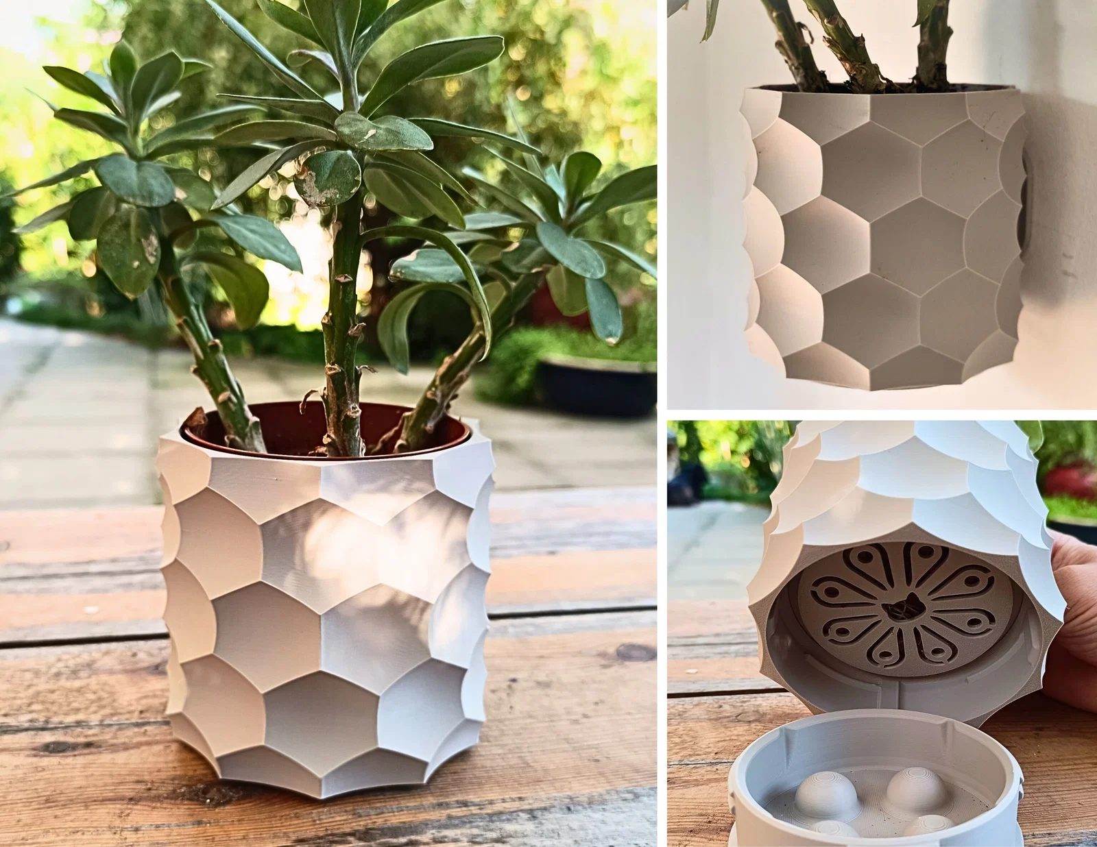 Chào mọi người, mình lại vừa thiết kế thêm một chậu cây mới, lấy cảm hứng theo design “Anti sphere” của “SASSy Design”. Như thường lệ, mẫu này có khay hứng nước ẩn và một kiểu wall mount thay thế. Điểm mới là phần wall mount có thể gỡ bỏ trong slicer khi bạn cắt mô hình. Sau khi cắt, bạn có thể chọn phần giá treo và xóa đi. Khi in không cần lưu ý gì và không cần supports. Màu mình dùng là mutet white của Polyterra! Chúc mọi người in vui vẻ.