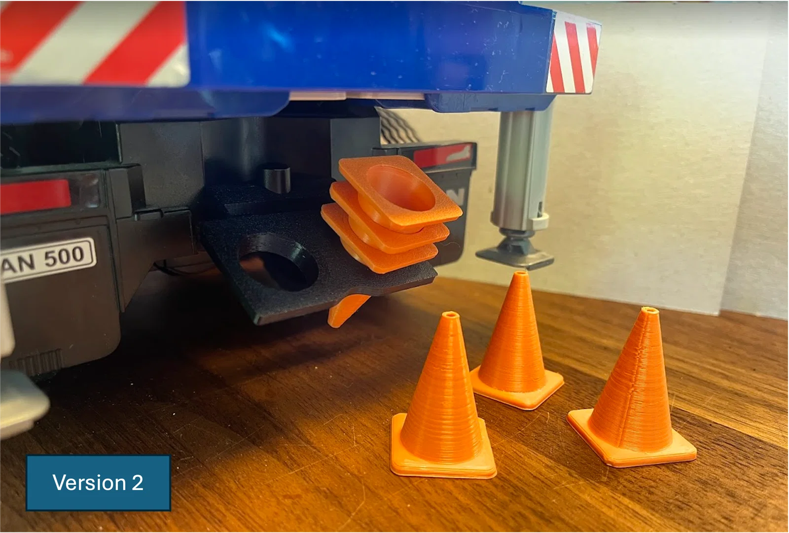 Giá đỡ giúp mang theo nhiều verkeerskegel/traffic cone trên móc kéo của xe BRUDER tỉ lệ 1:16. Thiết kế phù hợp móc kéo bản mới; bản cũ có thể bị xoay lệch. Có Version 2 với góc nhỏ hơn và ngàm giữ lớn hơn.