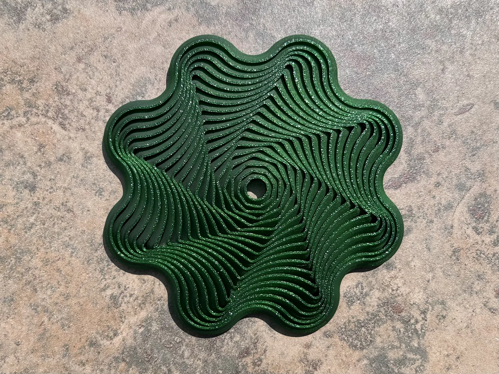Wavy Nested Fidget là đồ chơi fidget lồng nhau với thiết kế gợn sóng bắt mắt: từ 8 gợn bo tròn bên ngoài chuyển dần thành octagon ở trung tâm. In support-free, không cần brim; gợi ý layer 0.25mm.