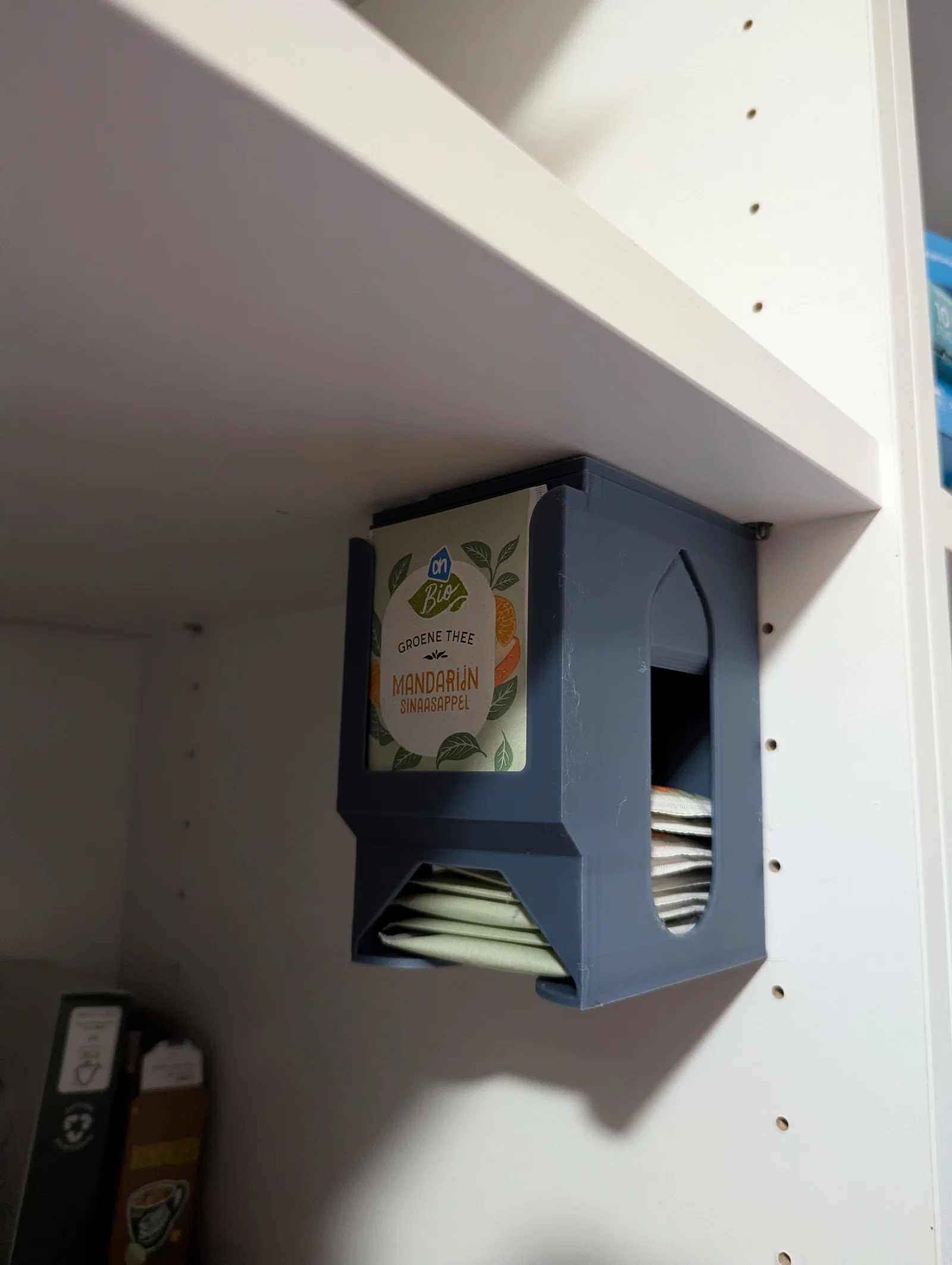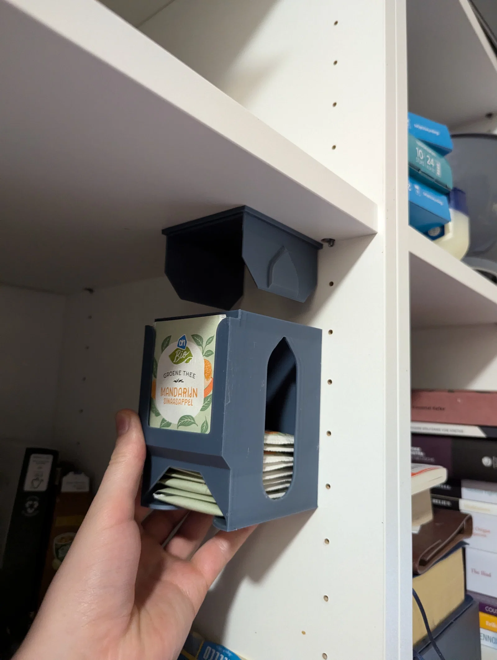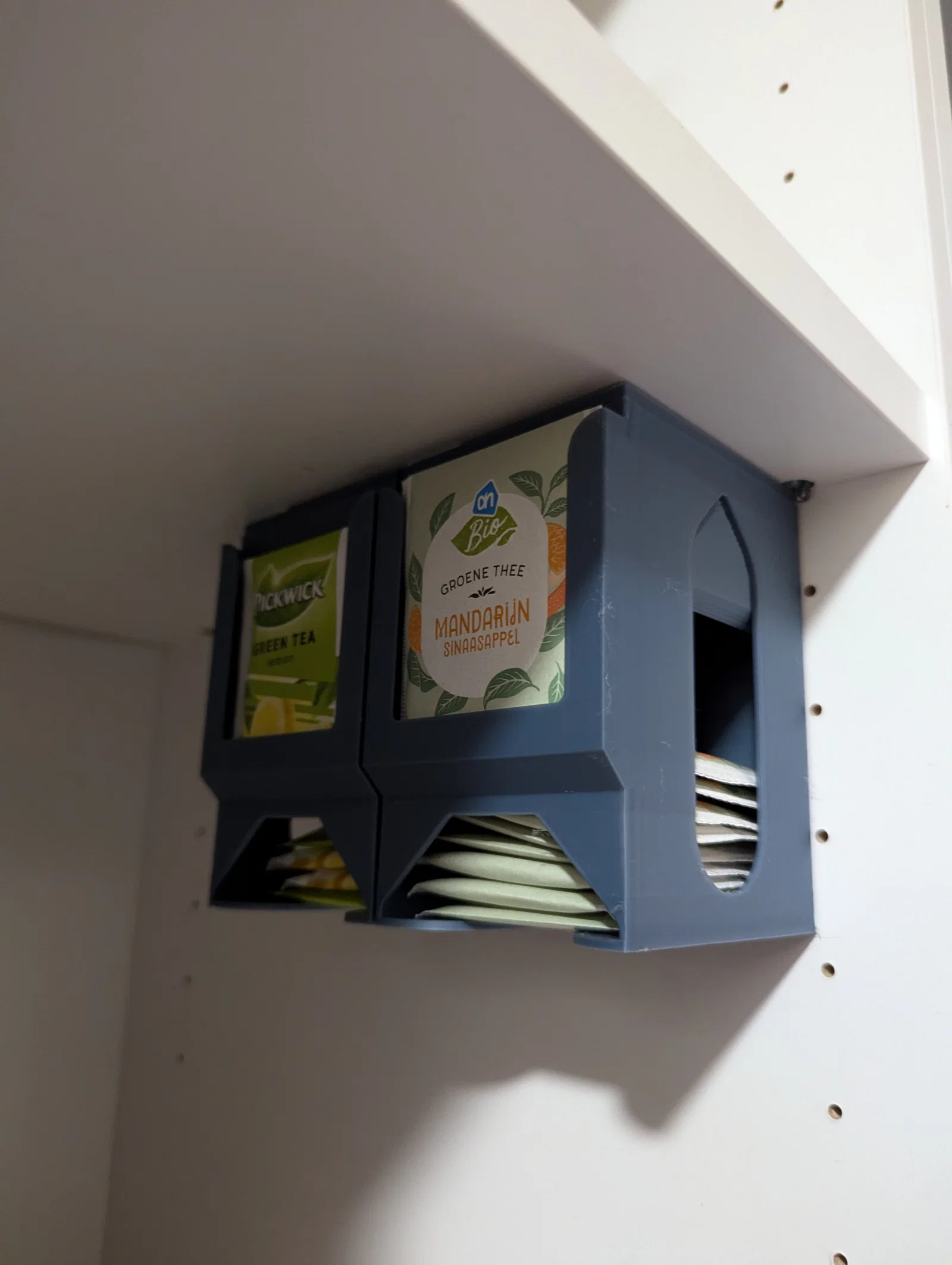 Mẫu giá treo túi trà kiểu gắn mặt trên, thiết kế đơn giản để lắp dưới kệ hoặc trong tủ. In không cần supports, nên dùng vật liệu cứng như PLA/ABS; dán mount lên bề mặt trên rồi trượt phần giữ vào cho khớp.