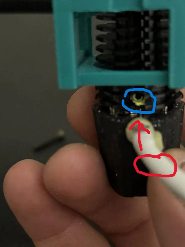 Một tấm hình có chỉ cách đặt dây cáp so với con ốc (được đánh dấu trong hình): bạn cần tháo hotend ra, canh lại vị trí dây, rồi vặn ốc lại.