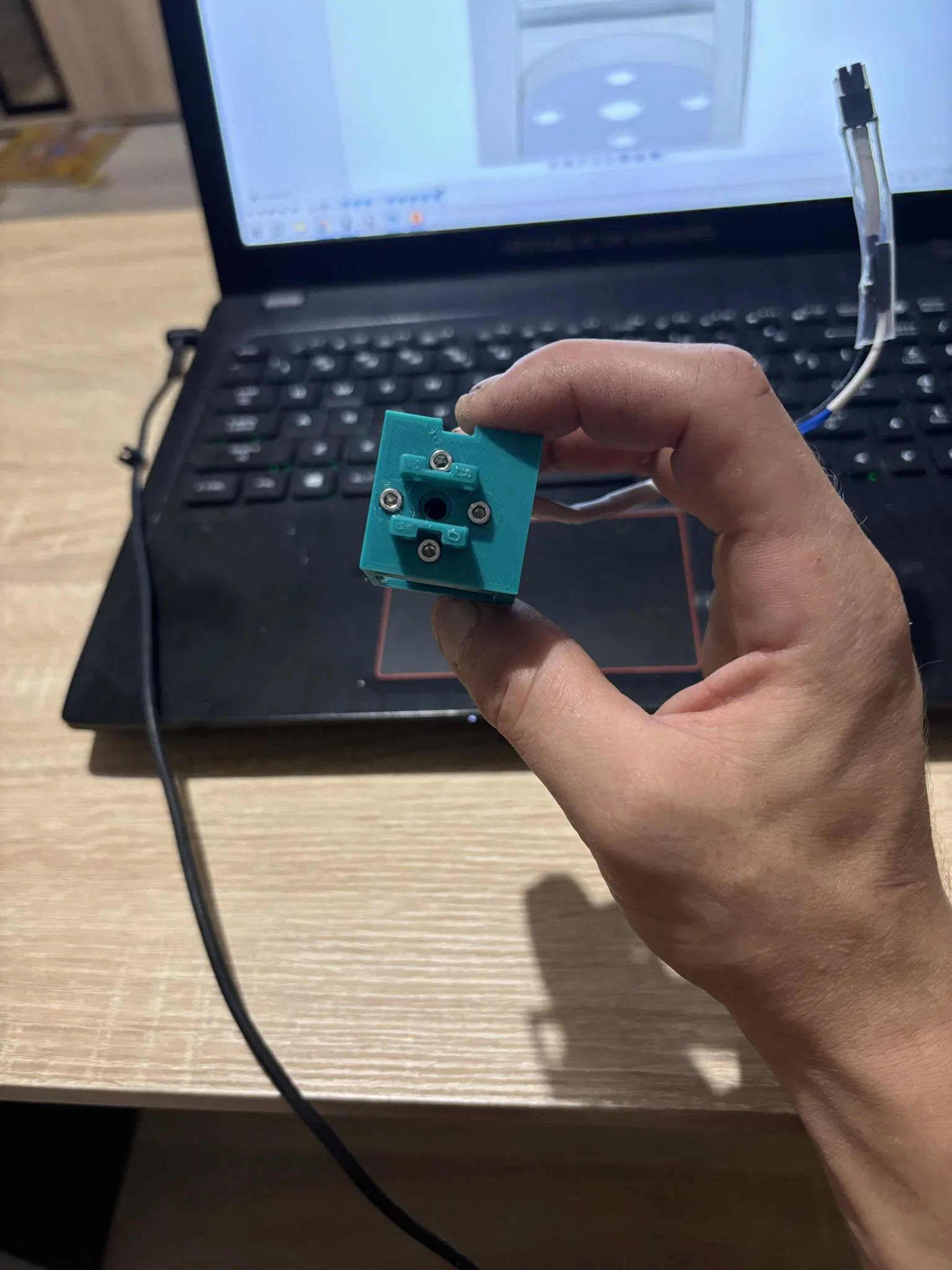 Một tấm hình có chỉ cách đặt dây cáp so với con ốc (được đánh dấu trong hình): cần tháo hotend ra, canh lại vị trí dây, rồi vặn lại.