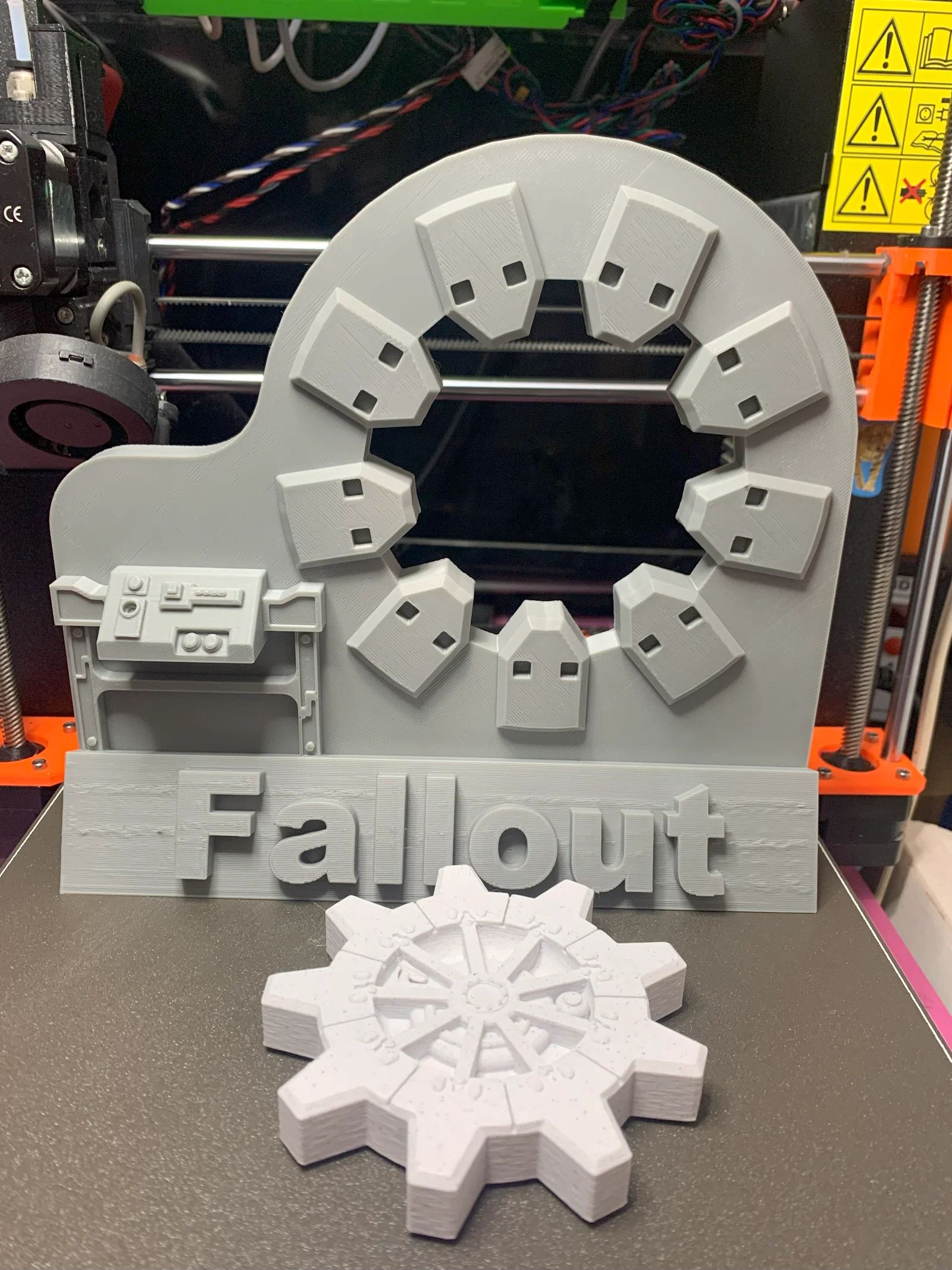 Mẫu Fallout Vault: cửa Vault không có số. Tác giả chia sẻ in phần đế trên máy Bamboo bị lỗi một vài lớp để tiết kiệm thời gian, trong khi in cửa bằng Prusa thì không gặp vấn đề. Thông số: layer 0.2mm, infill 15%, không supports.