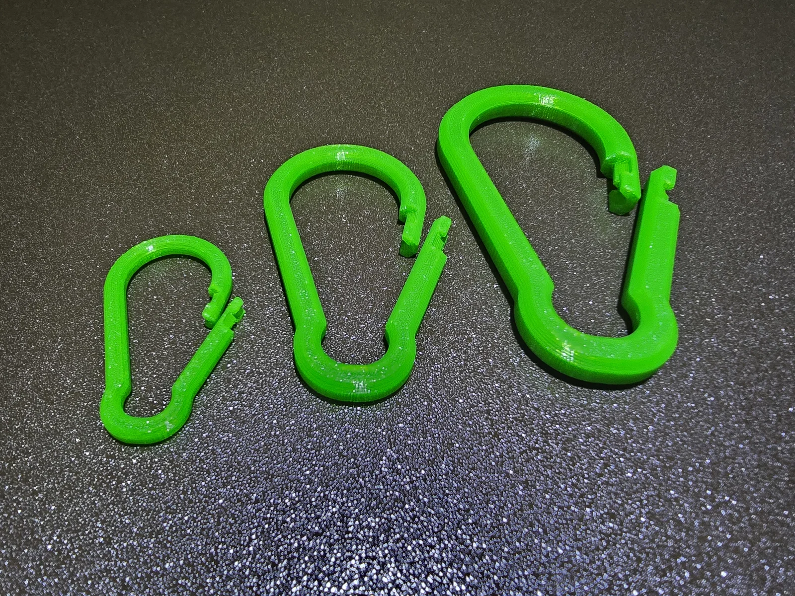 Móc carabiner chắc chắn, dễ in và không cần support, có cơ cấu Snap-Lock. Thiết kế thử nghiệm cho thấy bền nhất khi in 100% infill. Có 3 kích cỡ, bản v2 đã tăng tolerance khớp để hợp nhiều máy in hơn.