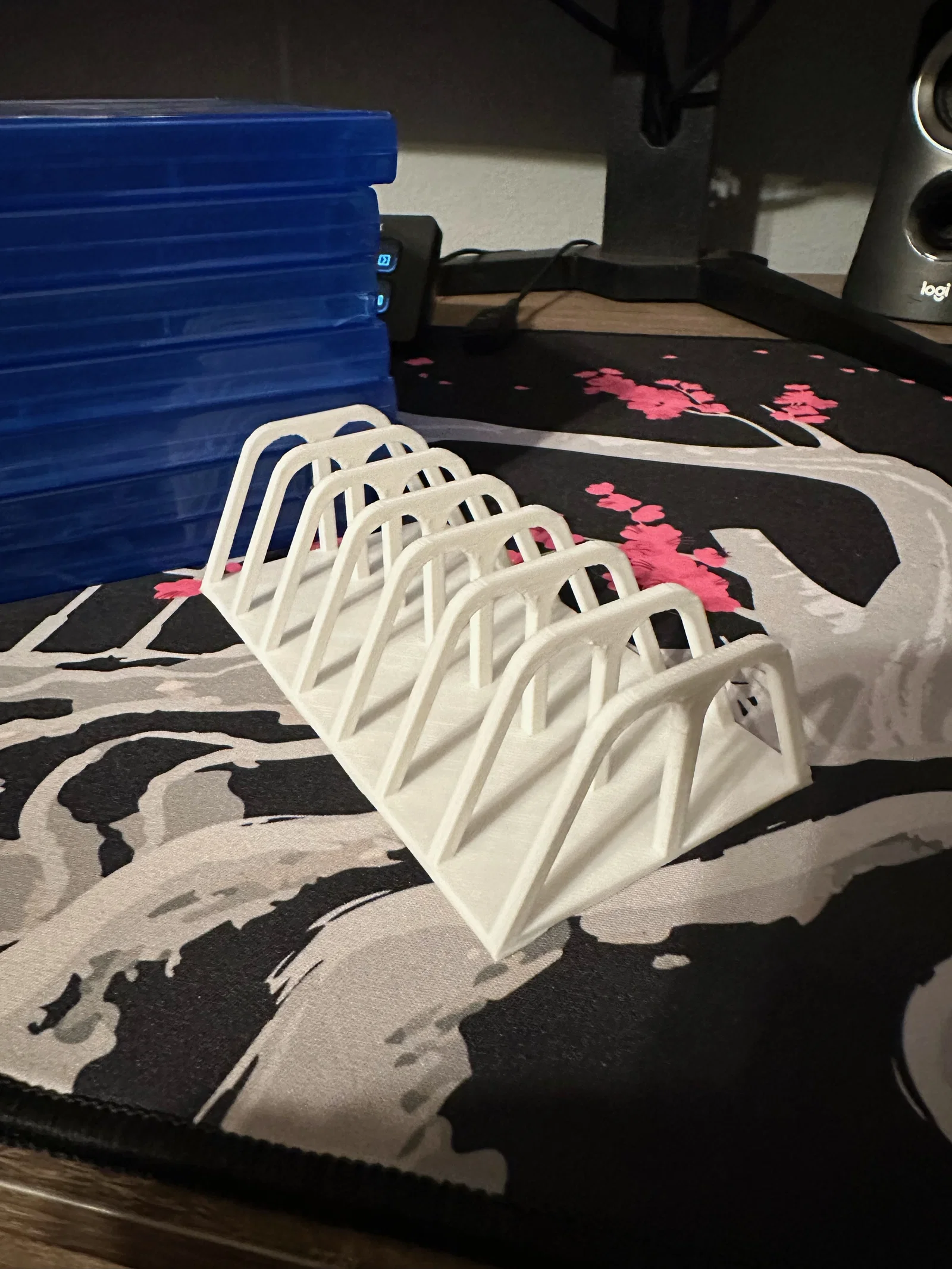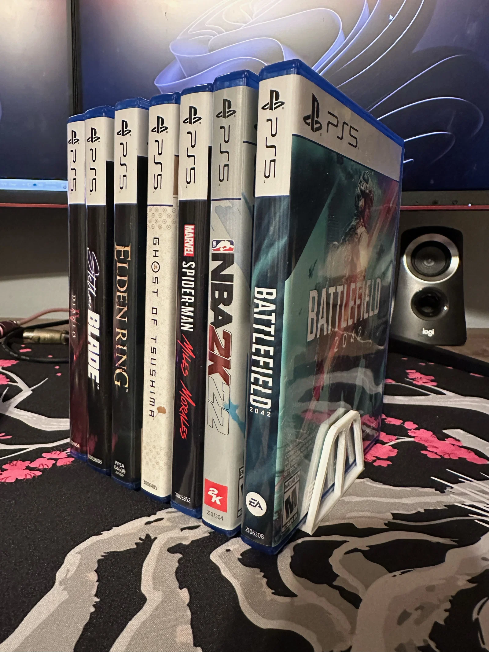 Một chiếc stand phong cách hiện đại, vừa giúp bạn sắp xếp gọn gàng các tựa game PS5 yêu thích, vừa trưng bày chúng theo cách nhìn rất đẹp mắt. Stand này chứa được tối đa bảy hộp game, giúp bạn lấy ra dùng nhanh chóng mà vẫn giữ không gian sạch sẽ, ngăn nắp. Phần aligner bổ sung ở phía trên là giải pháp đơn giản để giữ các hộp game thẳng hàng hoàn hảo, làm cho góc chơi game của bạn trông chuyên nghiệp và “xịn” hơn hẳn. Dù bạn là game thủ nghiêm túc hay chỉ đơn giản là thích khu giải trí gọn gàng, mẫu này vừa thực dụng vừa có tính thẩm mỹ. Mẫu này chưa được thử với các loại hộp game khác, nhưng nhiều khả năng vẫn dùng được với hộp game PS đời cũ, game Xbox, cũng như hộp Blu-ray.