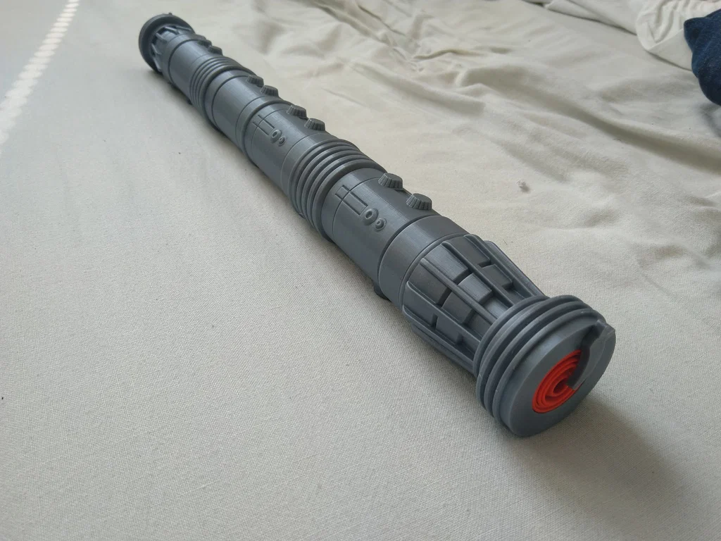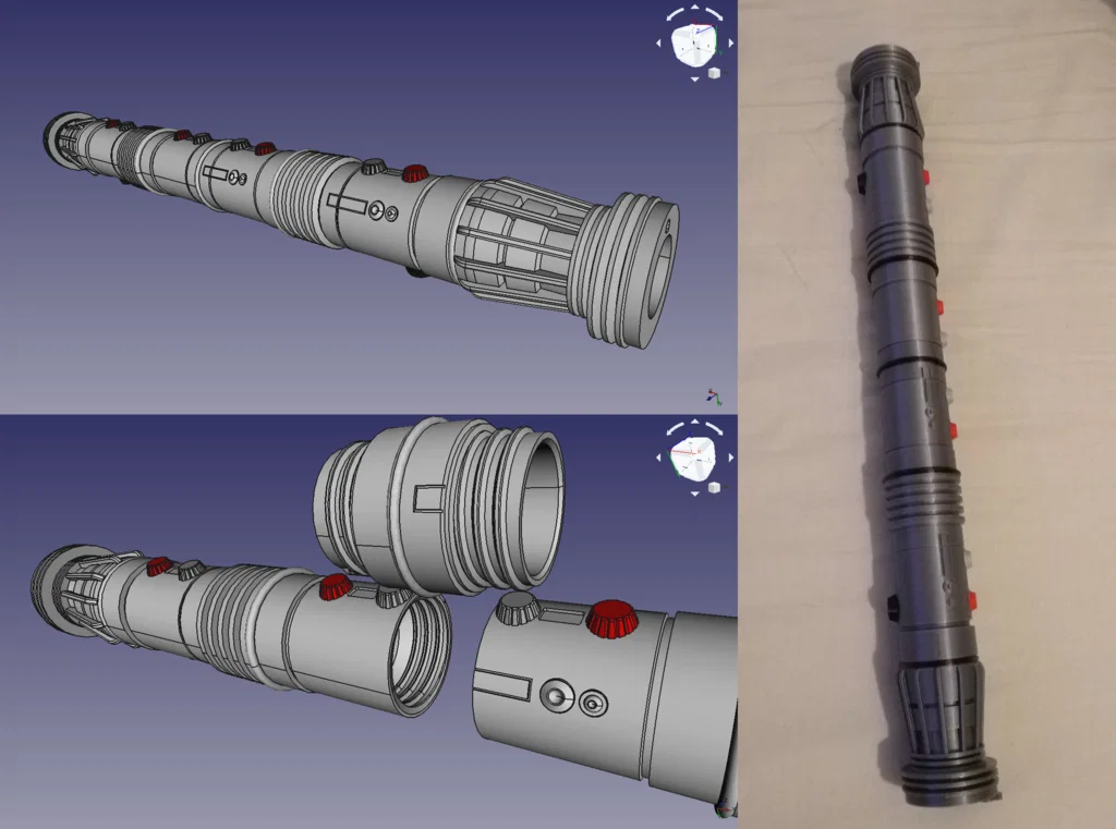 Một mẫu lightsaber dạng rút (collapsing), kiểu Darth Maul, dựa trên ý tưởng gốc của 3DPRINTINGWORLD. Phần cán (hilt) được thiết kế lại từ đầu, còn phần lưỡi có thể tái sử dụng. Thiết kế bằng FreeCAD, có kèm file project cũng như template FreeCAD của mình.