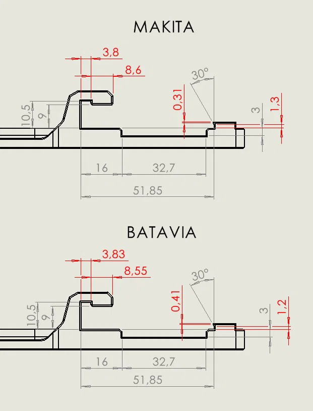 Bản remix thước vuông của Prateek R, tối ưu để khớp khít hơn với ray Makita & Batavia và dễ in dựng đứng. Có thêm phiên bản chừa khoảng trống để kẹp (clamp) cố định ray khi làm mộc.