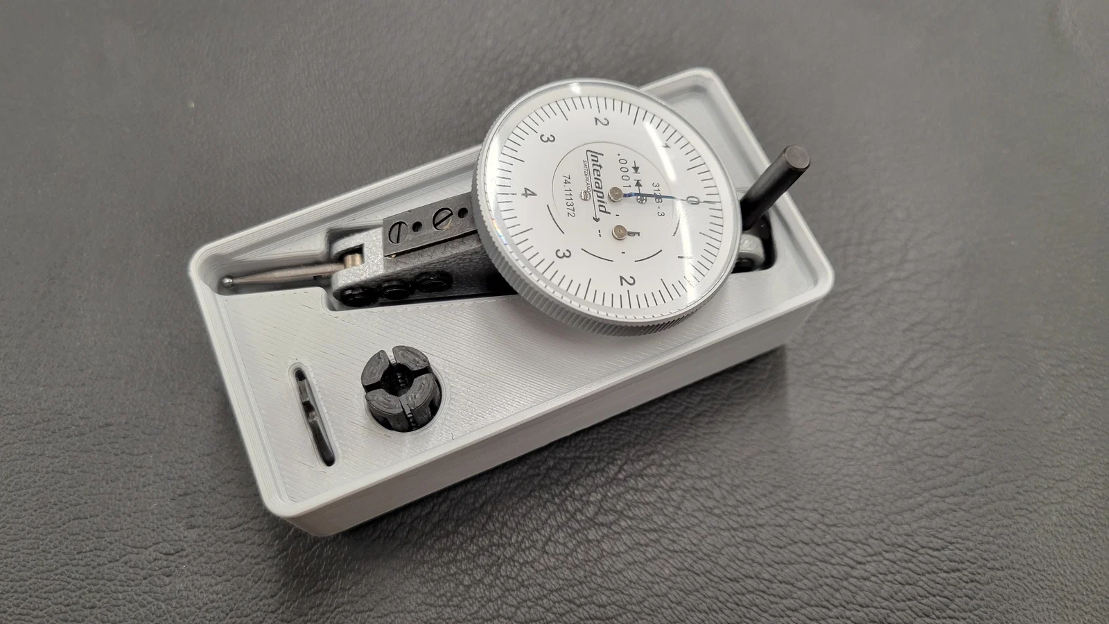 Đối với những anh em thợ cơ khí hoặc những người làm kỹ thuật chính xác, việc giữ gìn dụng cụ đo là cực kỳ quan trọng. Chiếc đồng hồ so Interapid (Dial Test Indicator) là một thiết bị đo lường tinh xảo và đắt tiền, vì vậy nó cần một nơi lưu trữ chuyên biệt để tránh va đập hoặc trầy xước không đáng có. Mẫu khay này được thiết kế theo hệ sinh thái Gridfinity, giúp anh em dễ dàng sắp xếp gọn gàng trong các ngăn kéo tủ đồ nghề, đảm bảo thiết bị luôn nằm đúng vị trí và sẵn sàng cho công việc.