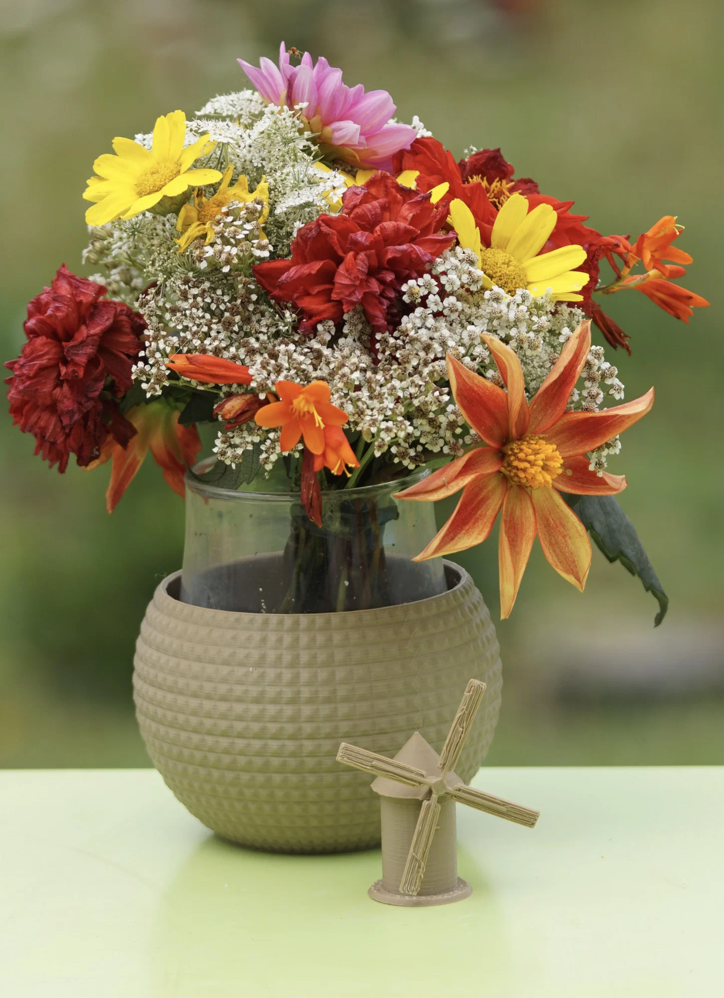 Mẫu cối xay gió mini mô phỏng kiểu truyền thống theo tỉ lệ nhỏ cho mô hình cỡ N, có thể phóng to tùy nhu cầu. Cánh nghiêng 10%, tổng chiều cao 4,5 cm. Có 2 phiên bản cánh: in liền hoặc bắt vít để chịu gió tốt hơn.