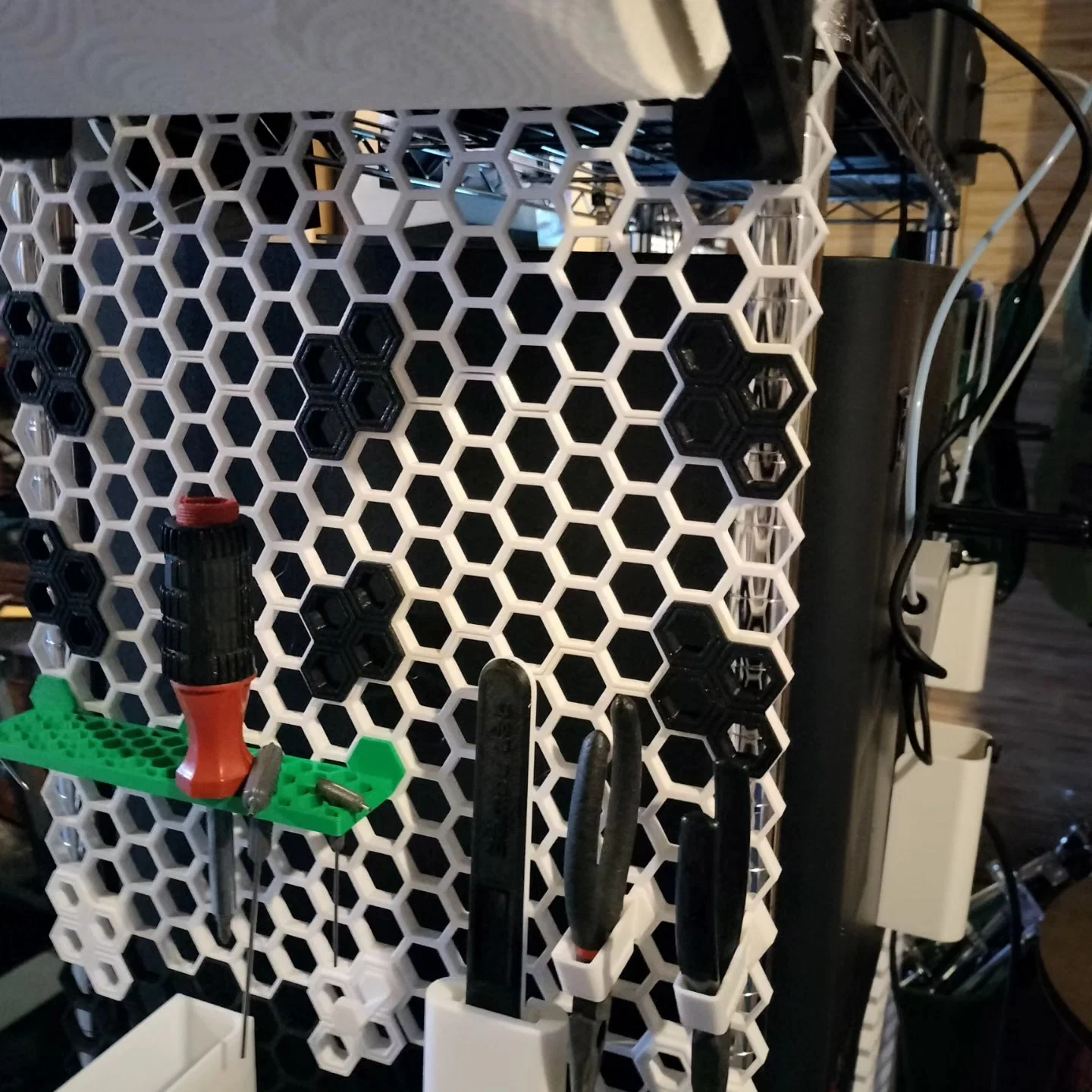 Một điểm hay khi dùng honeycomb trên wire rack là bạn có thể tiếp cận cả hai mặt của vách honeycomb để gắn phụ kiện; trong khi đa số các hexagonal plug được thiết kế để luồn qua một phía của lưới rồi khóa vào phía còn lại, mình thấy những phụ kiện nhẹ có thể cắm từ bên nào của vách honeycomb cũng được, giúp tăng thêm không gian lưu trữ.