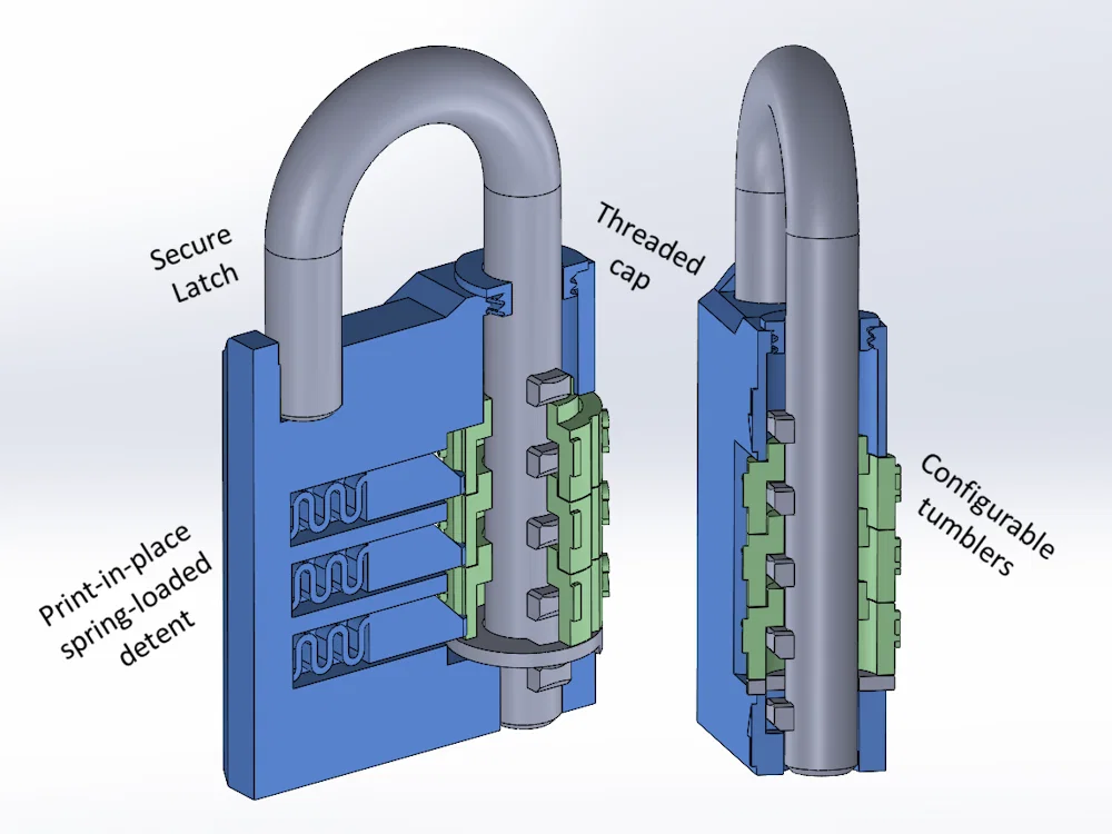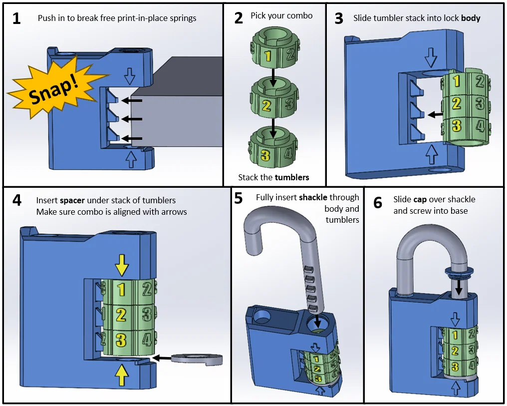 Mẫu Combination Padlock v2 là ổ khóa số in 3D hoạt động được, có thể thay ổ Master Lock cho locker. Có tuỳ chọn 3/4 tumbler, 6/10 digits, combo tới 10.000; hỗ trợ in lò xo print-in-place hoặc lò xo rời.