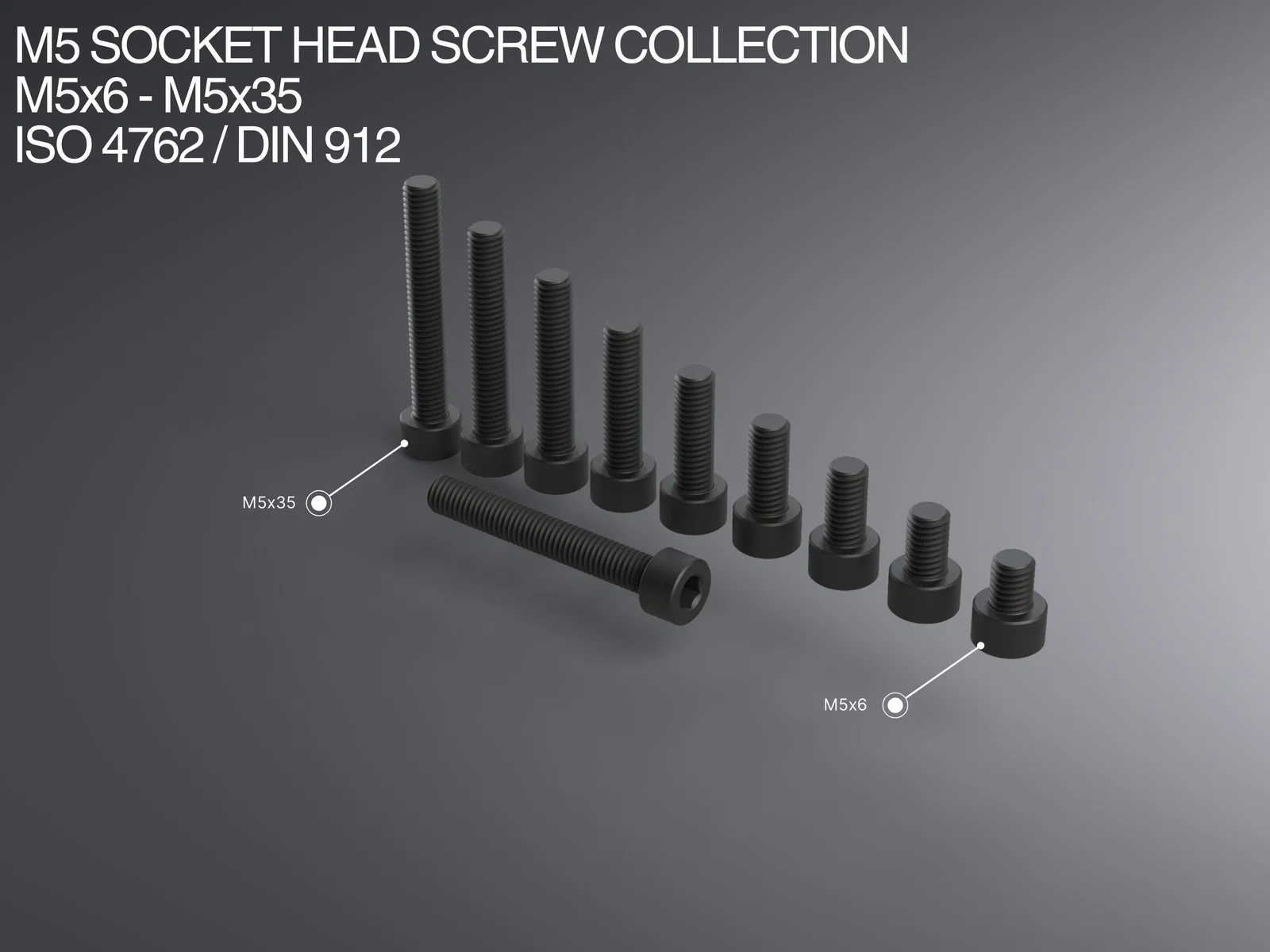 Bộ sưu tập vít M5 Socket Head theo chuẩn ISO 4762 / DIN 912, gồm các size M5x6 đến M5x35. In PLA/PETG dùng phổ thông ổn; ứng dụng nặng nên chọn vật liệu dai hơn. Nếu khít, giảm scale 0.5–1%.